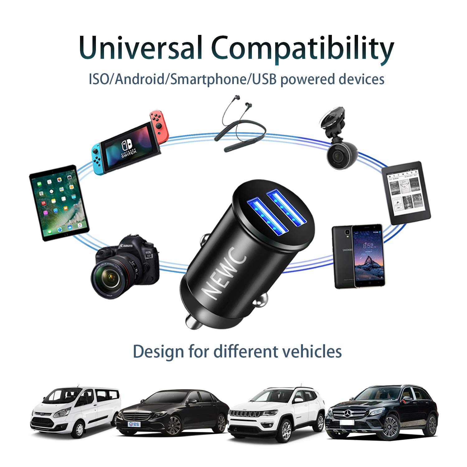 • Rechargez facilement et simplement vos appareils mobiles avec ce chargeur allume-cigare NEW’C. Compatibilité : smartphone, tablette, GPS, PDA, lecteur MP3, iPod, iPhone, iPad, etc.