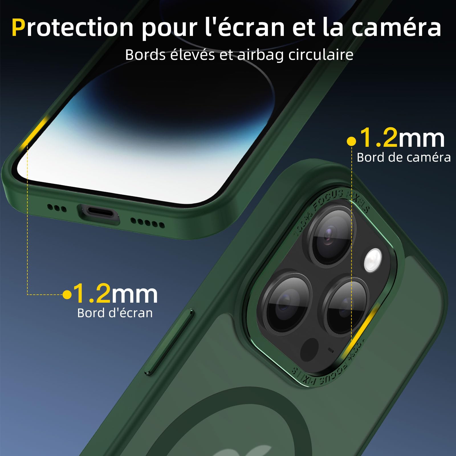 • Protection de l’appareil photo: Les rebords surélevés autour de l’écran et de l’objectif garantissent une protection supplémentaire contre les rayures et les chocs, même lorsque votre iPhone est posé face contre terre, pour une sécurité maximale.