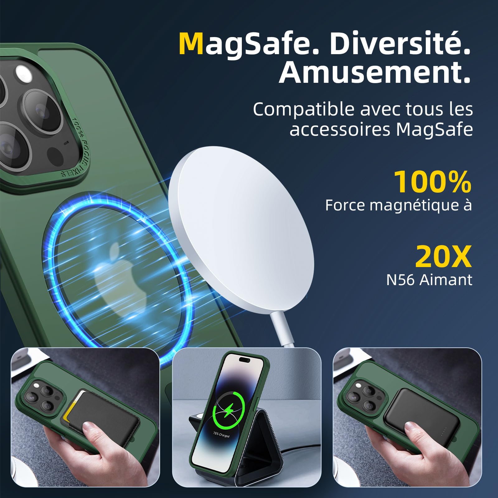 • Verrouillage magnétique ultra-puissant: Équipée de 42 aimants N56 de haute performance, cette coque offre une puissance magnétique augmentée de 50%, assurant une fixation stable et rapide de votre iPhone 14 Pro (6,1 Pouces) avec les accessoires compatibles MagSafe, même sur les routes les plus accidentées.
