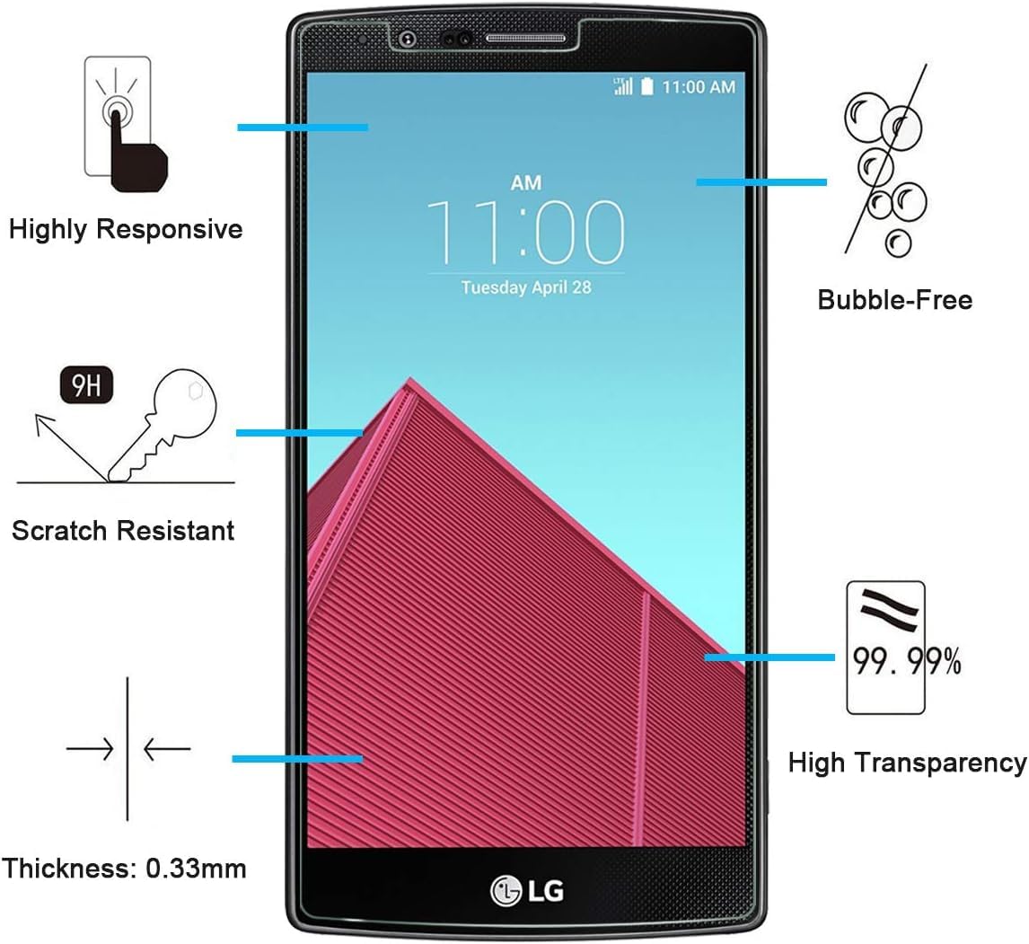 • ATTENTION: NON Compatible avec Lg G4 Mini, G4C, G4S et G4 Stylus. Fabriqué en verre trempé premium haute qualité avec 0,33 mm épaisseur avec les bordures arrondis, Solution idéale d’anti-casse: Extrêmement haute dureté, protège l’écran du téléphone des chocs et des dommages accidentels