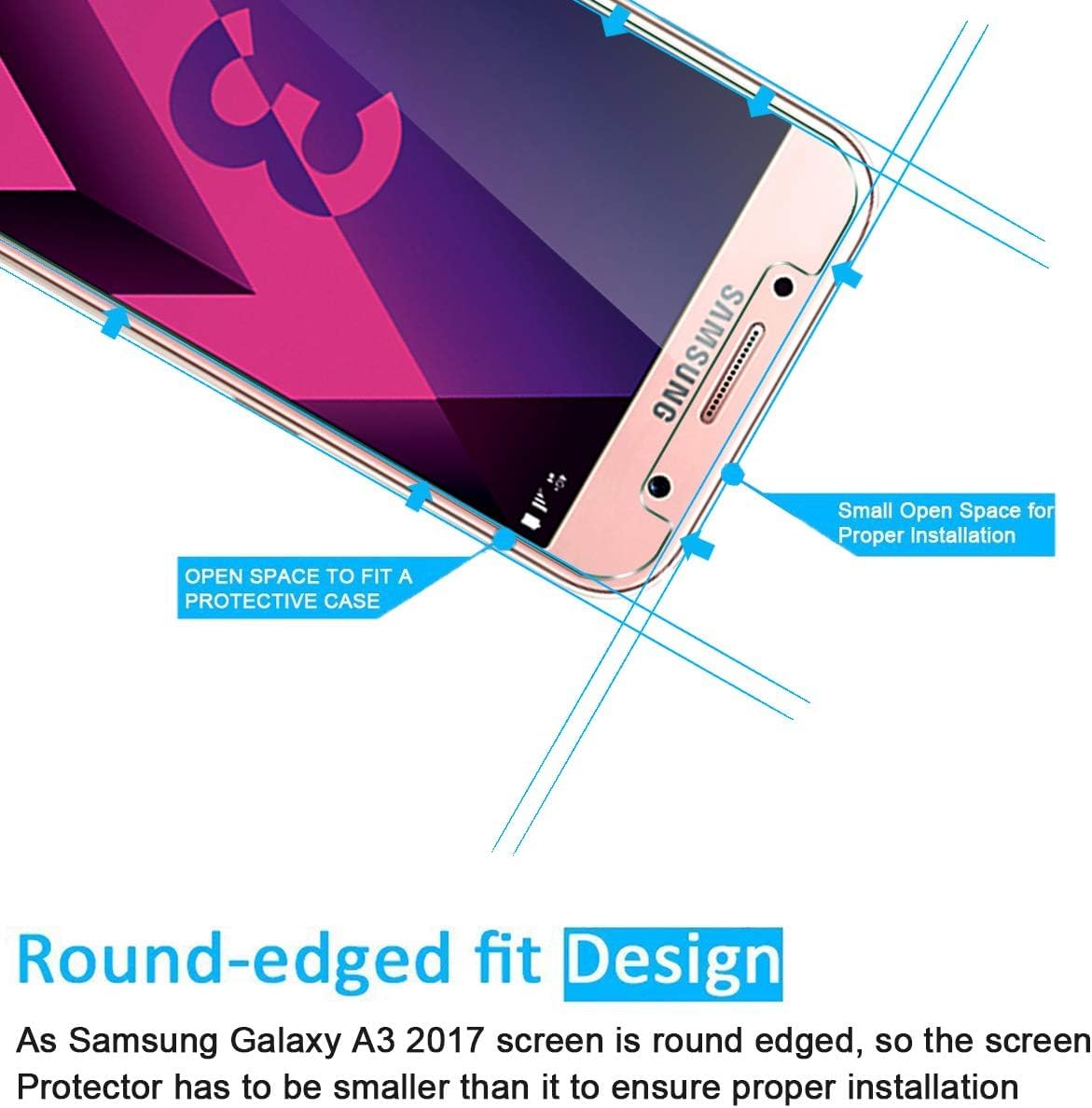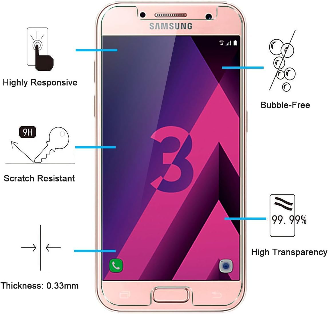 • Lot de 3 Verre Trempé Samsung Galaxy A3 2017 (SM-A320F), Très grande dureté: résiste aux égratignures jusqu’à 9H . Haute-réponse et une grande transparence.