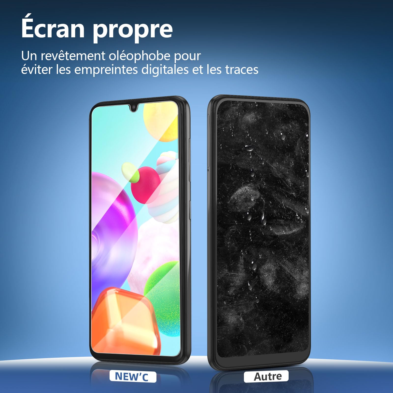 • Oléophobe: il a un revêtement oléophobique qui empêche les empreintes digitales et d’autres contaminants et rend le film facile à nettoyer.