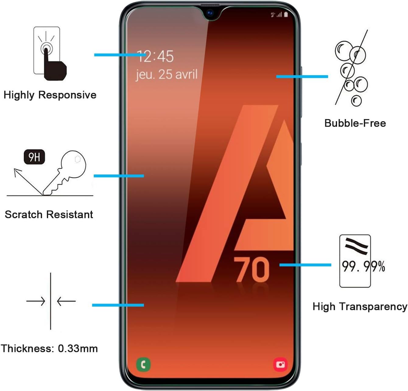 - Pack de 3 Verre Trempé Samsung Galaxy A70. Dureté 9H, résistance aux raillures. Réponse tactile améliorée et super transparent.