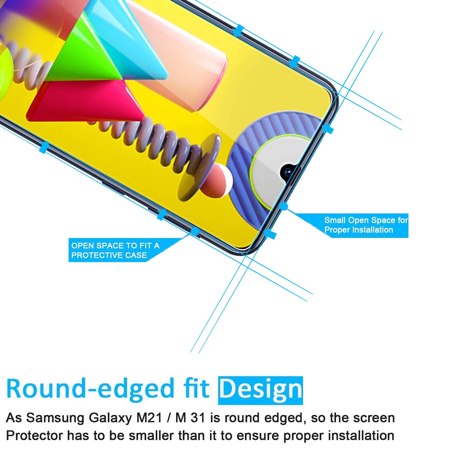 - Remarque: C’est parce que l’écran de Samsung Galaxy M21, M31 est avec les bordures incurvés, donc le protecteur ne recouvre pas complètement l’écran, mais seulement la zone plate.