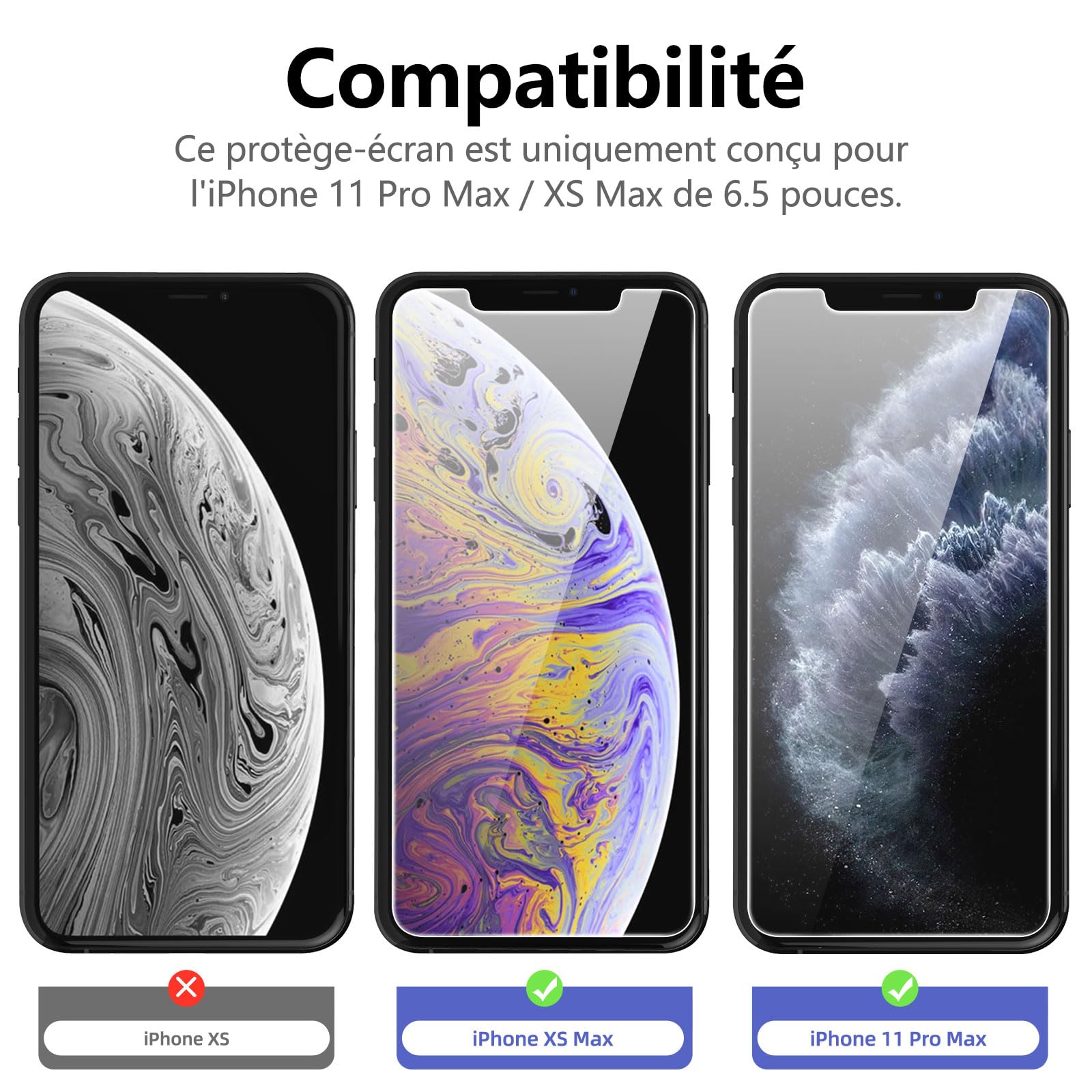 R : Oui, ce Protection d’écran Verre trempé iPhone 11 Pro Max / iPhone XS Max est parfaitement compatible avec : iPhone 11 Pro Max, iPhone XS Max.