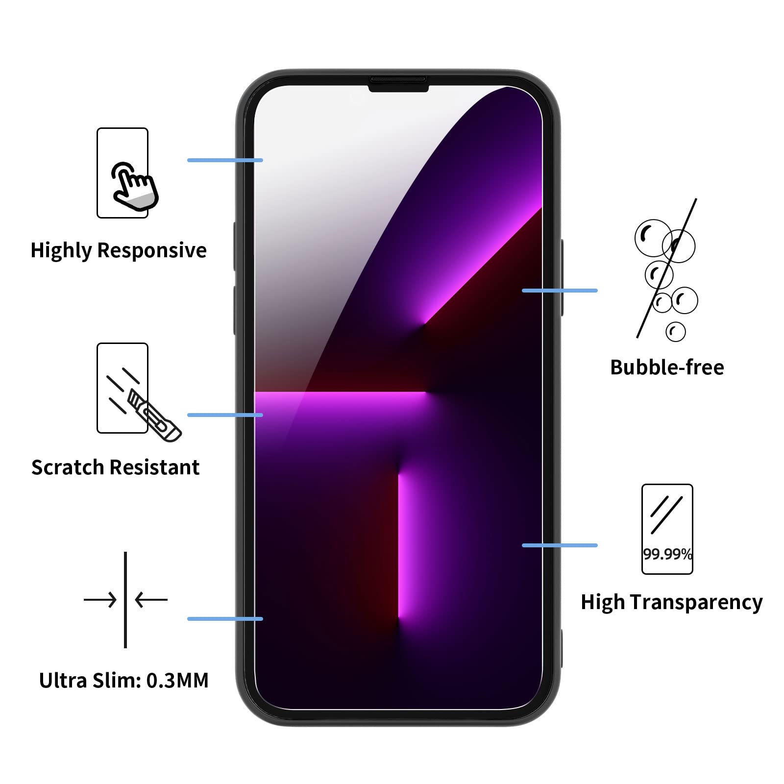 - Très haute dureté, Résiste aux impacts jusqu’à 9H. Haute-réponse et haute transparence.