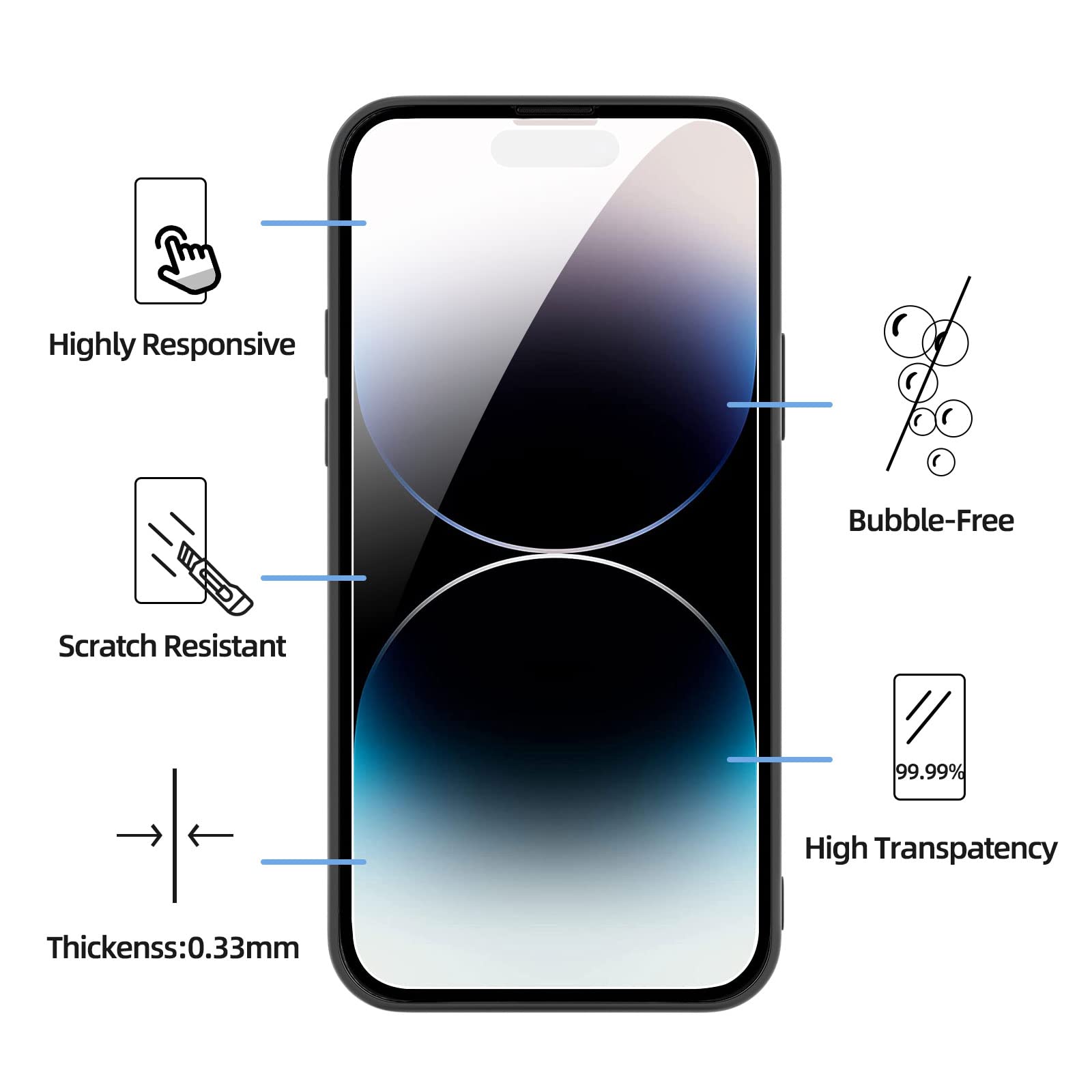 Les protections d’écran en verre trempé sont fabriquées à partir de matériaux de haute qualité, offrant une dureté exceptionnelle de 9H qui résiste aux impacts et protège l’écran de votre iPhone 14 Pro contre les dommages accidentels. Avec une épaisseur de seulement 0,33 mm et des bordures arrondies, ces films de protection garantissent une haute transparence et une réponse tactile optimale, vous permettant de profiter pleinement de l’affichage HD de votre téléphone sans compromis.