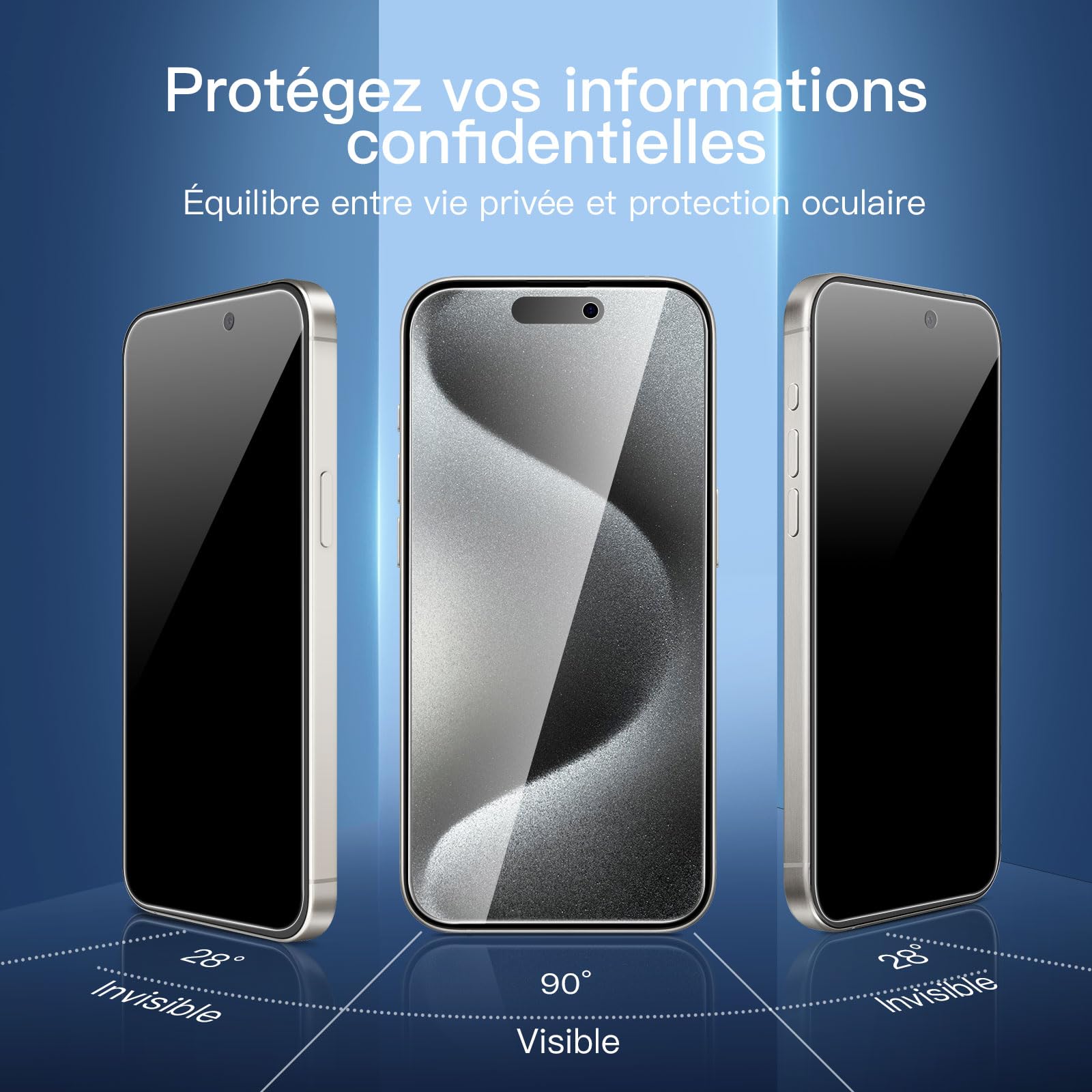 Kit de protection d’écran en verre trempé anti-espion pour iPhone 15 Pro Max, offrant une confidentialité améliorée et une protection robuste.