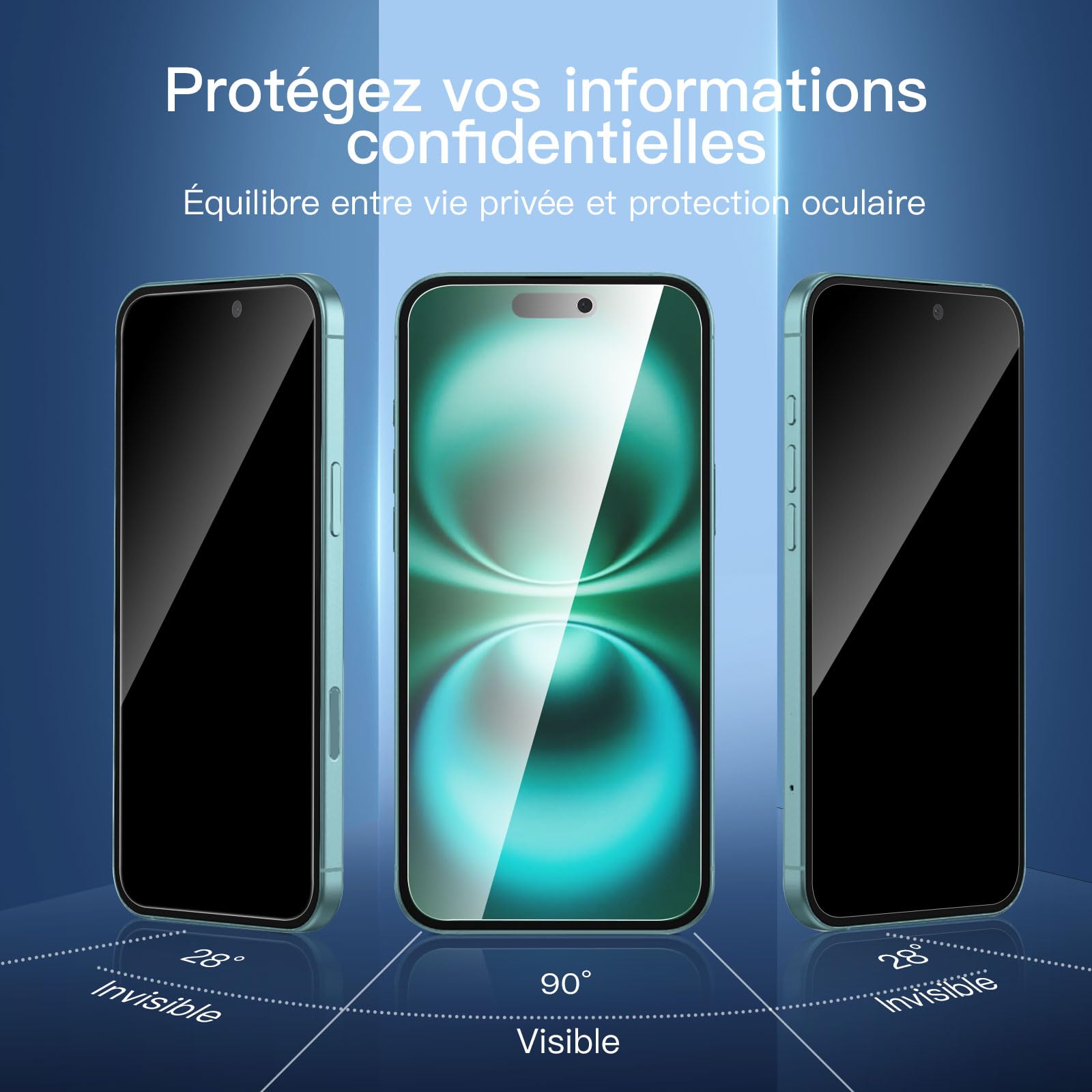- Fournit une couche supplémentaire de protection de la vie privée : le filtre de confidentialité avancé bloque la visualisation sous n’importe quel angle supérieur à 28° pour garder ce qui est sur l’écran de votre iPhone 16 Plus (6,7 Pouces) pour vos yeux uniquement.