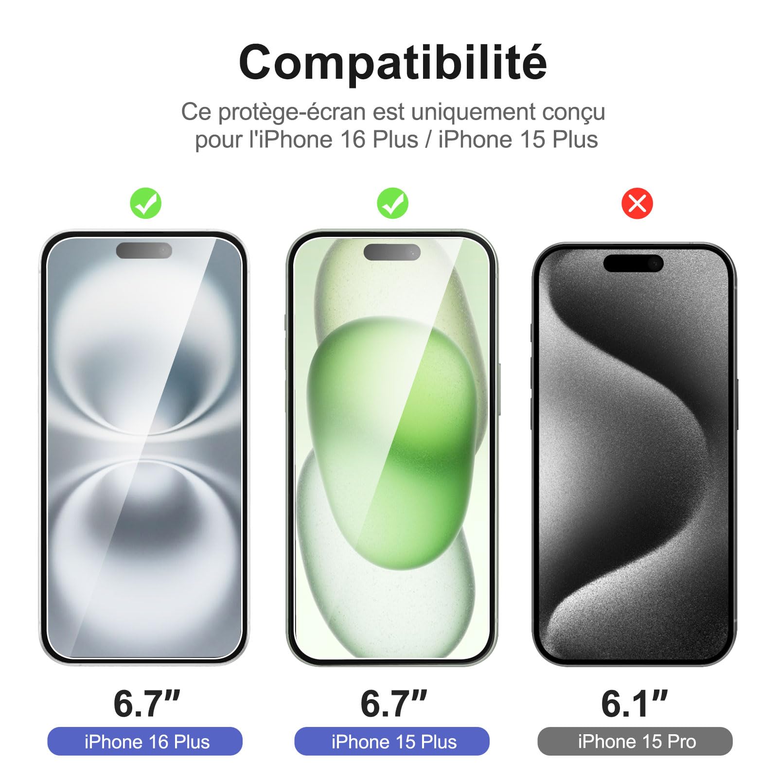 R : Oui, ce Protection d’écran Verre trempé iPhone 16 Plus / iPhone 15 Plus est parfaitement compatible avec : iPhone 16 Plus, iPhone 15 Plus.