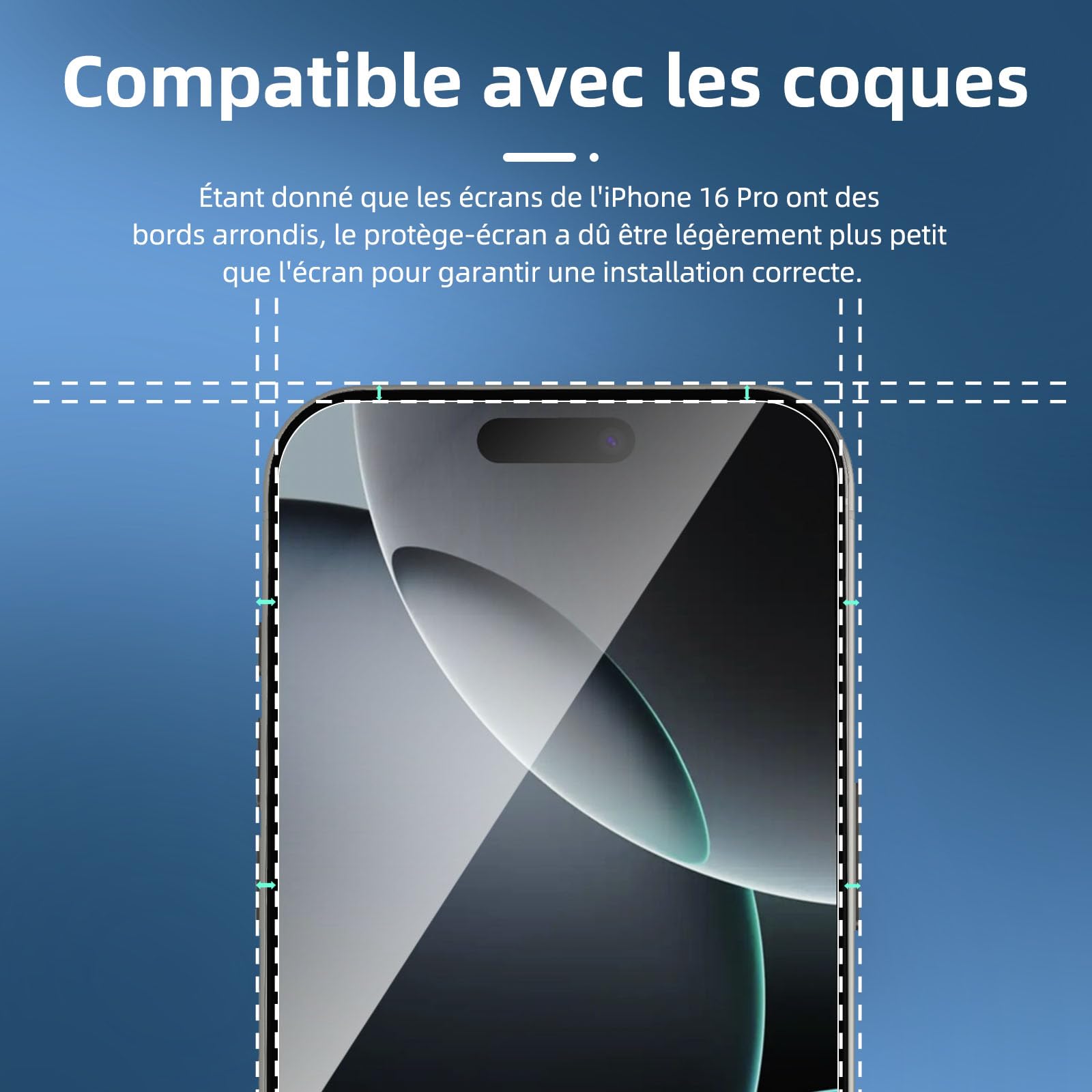- Le protecteur d’écran offre une protection maximale pour l’écran tactile de iPhone 16 Pro (6,3 Pouces). L’espace entre iPhone 16 Pro (6,3 Pouces) et le protecteur d’écran permet l’espace approprié pour l’installation de la plupart des coques de téléphone.