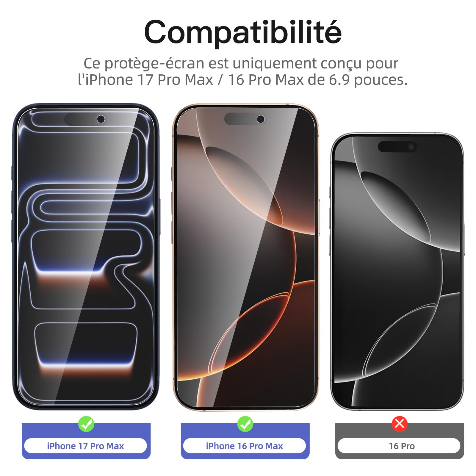 R : Oui, ce Protection d’écran Verre trempé iPhone 17 Pro Max / iPhone 16 Pro Max est parfaitement compatible avec : iPhone 17 Pro Max, iPhone 16 Pro Max.