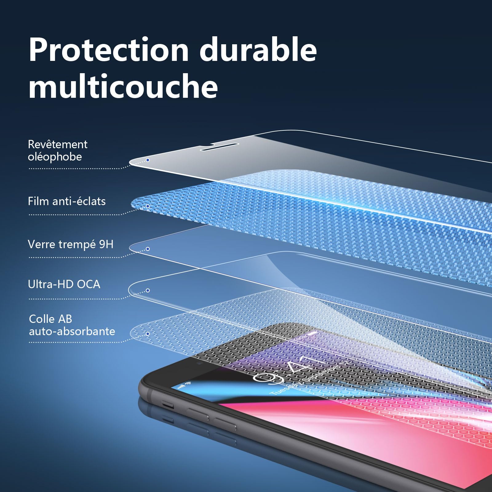 | Fonctions spéciales | Anti-bulle, «Touch Sensitive», Anti-éclat, Anti-empreinte digitale, Résistant à la rayure |