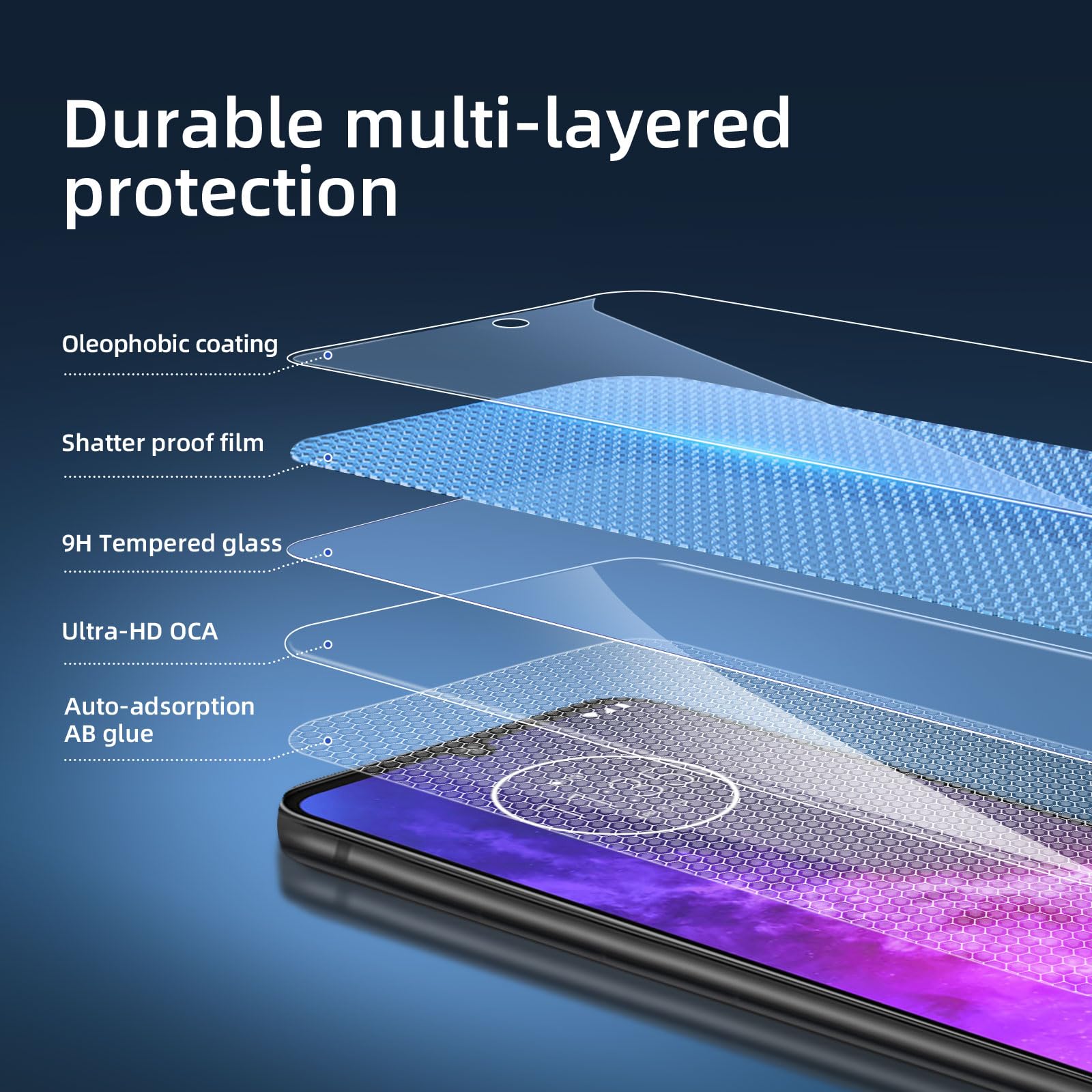 • Installation sans poussière, sans empreintes digitales, facile d’une simple pression, sans bulles.Oléophobe: il a un revêtement oléophobique qui empêche les empreintes digitales et d’autres contaminants et rend le film facile à nettoyer.
