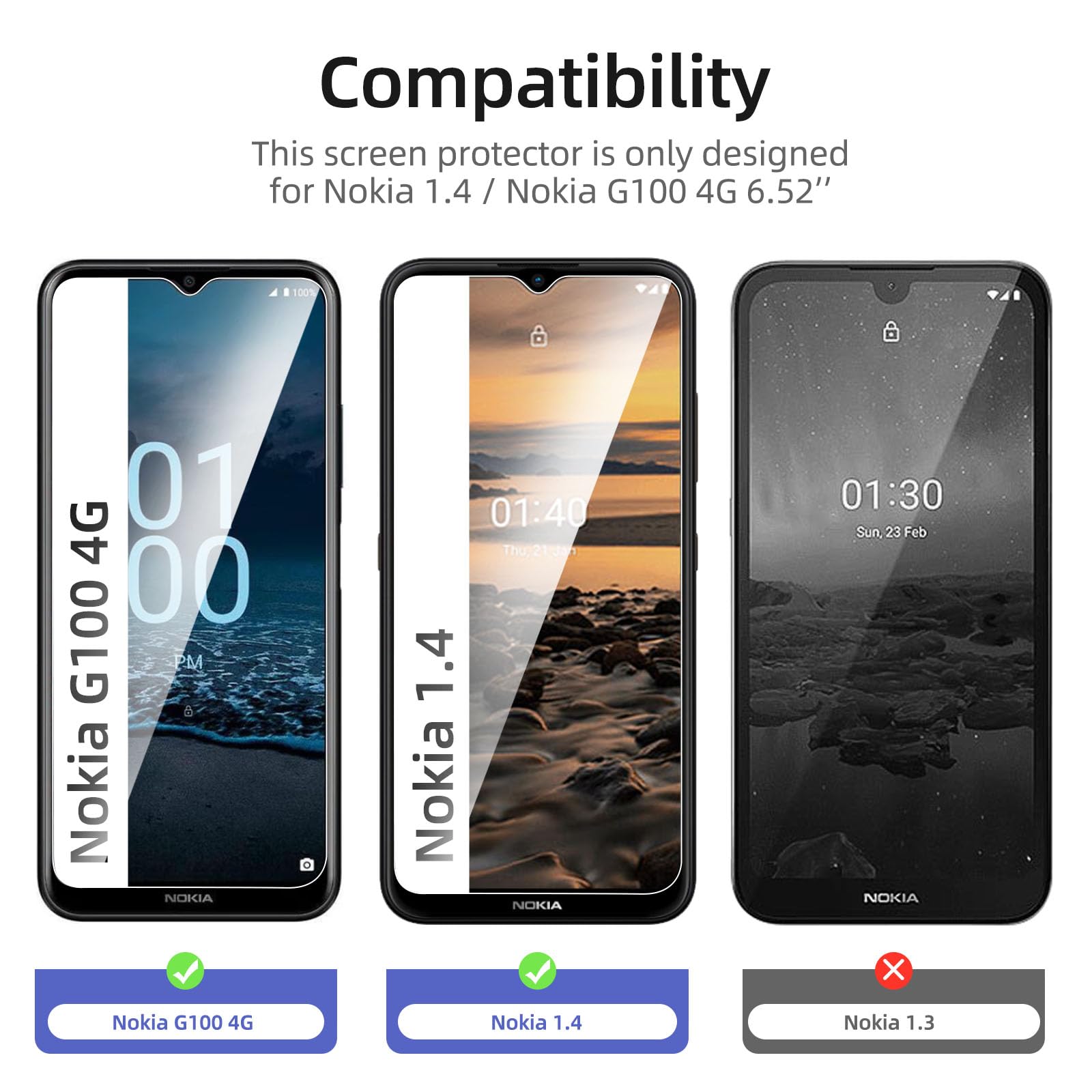 R : Oui, ce Protection d’écran Verre trempé Nokia 1.4 / Nokia G100 4G est parfaitement compatible avec : Nokia 1.4, Nokia G100 4G.