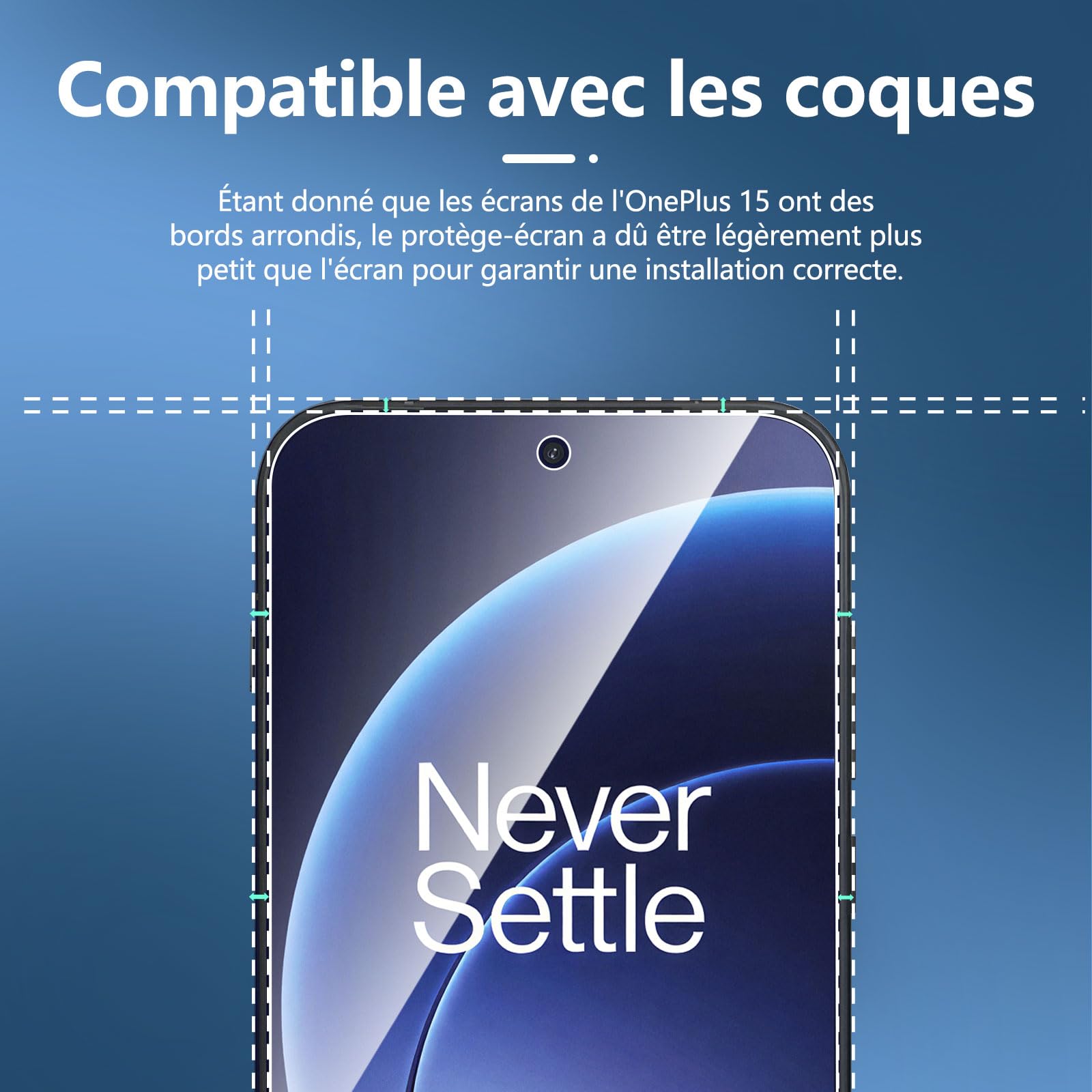 • NEW’C Protection d’écran en Verre Trempé OnePlus 15. Touche délicate: il est revêtu sur le dos avec un adhésif de silicium solide qui rend l’installation facile et attache le film fermement afin de ne pas influer sur la sensibilité de l’écran tactile.
