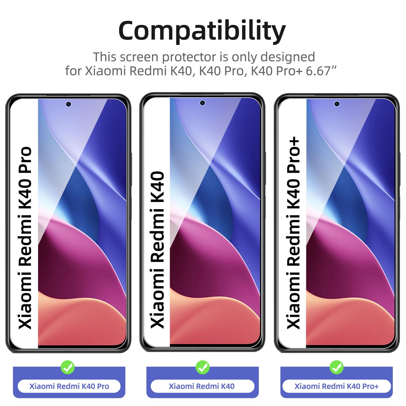 R : Oui, ce Protection d’écran Verre trempé Redmi K40 / Redmi K40 Pro / Redmi K40 Pro+ est parfaitement compatible avec : Redmi K40, Redmi K40 Pro, Redmi K40 Pro+.