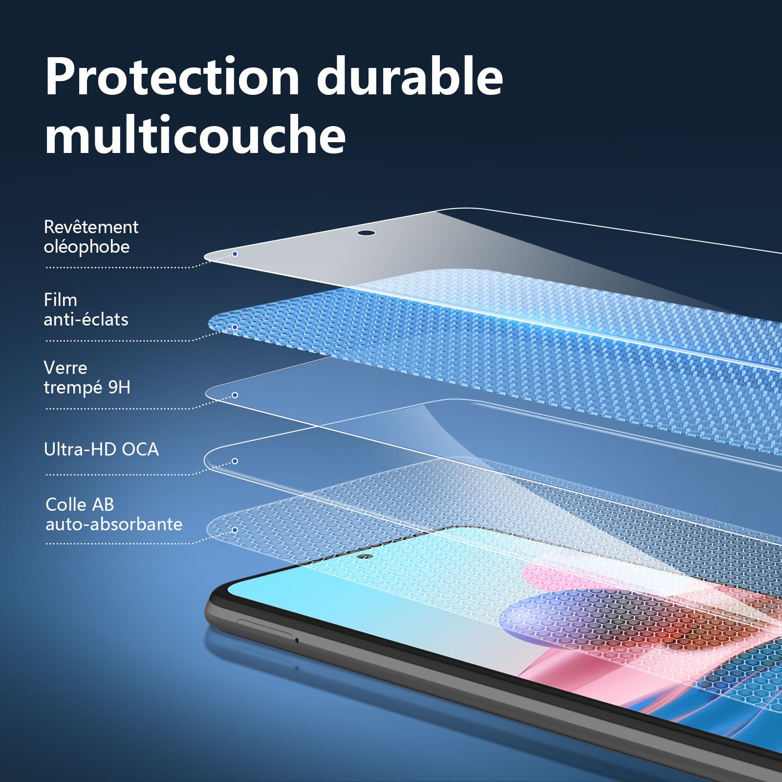 - Oléophobe: il a un revêtement oléophobique qui empêche les empreintes digitales et d’autres contaminants et rend le film facile à nettoyer.
