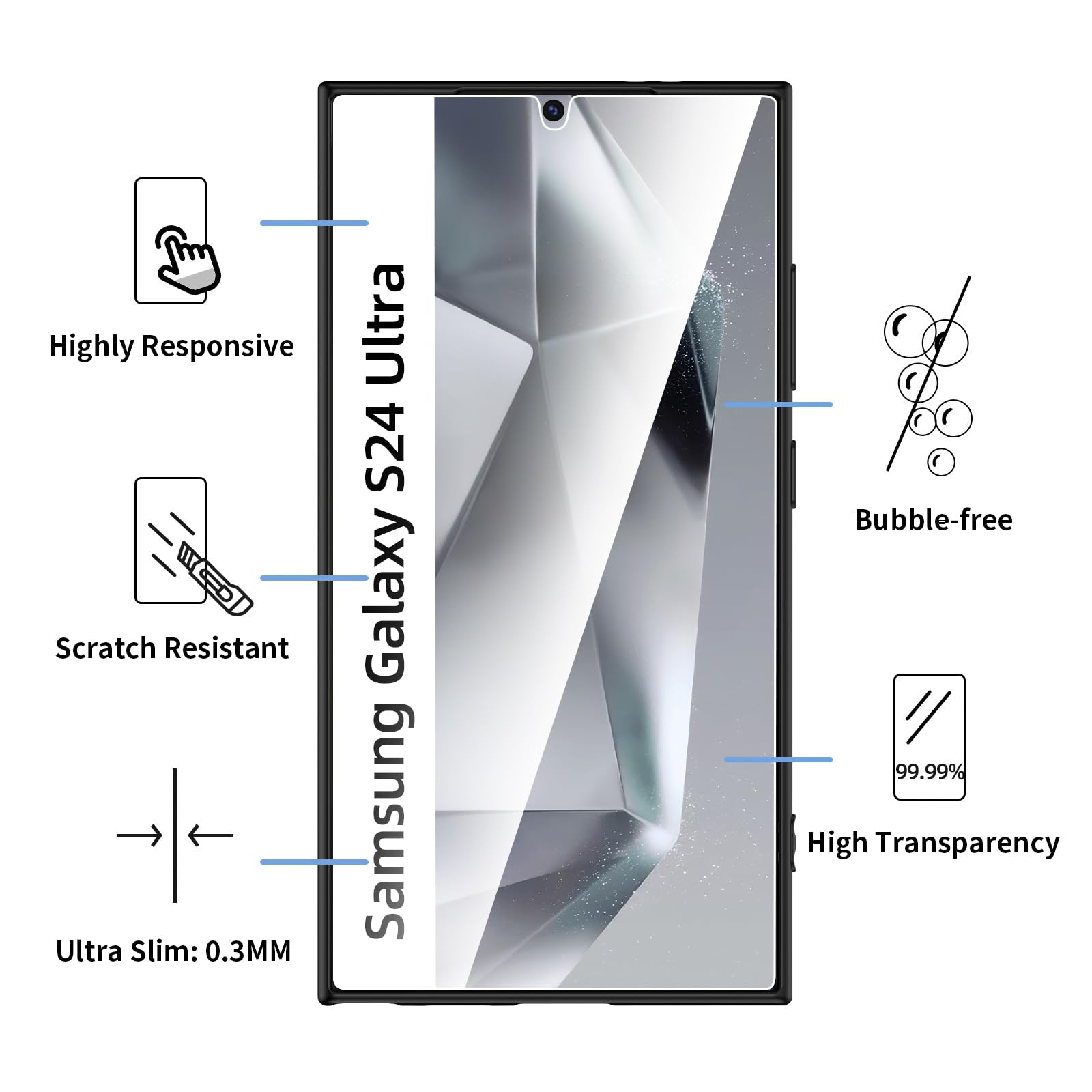 Les protections d’écran en verre trempé sont fabriquées à partir de matériaux de haute qualité, offrant une dureté de 9H pour résister aux impacts et aux dommages accidentels. Avec une épaisseur de seulement 0,26 mm, elles garantissent une haute transparence et une réponse tactile optimale, vous permettant de profiter pleinement de l’écran de votre Galaxy S24 Ultra sans compromis.
