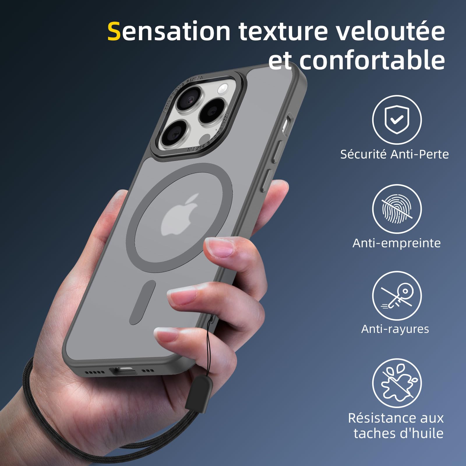 Fonctions spéciales Compatible MagSafe, Protection antichoc militaire, Avec cordon détachable, Résistant à la rayure, Dos mat translucide