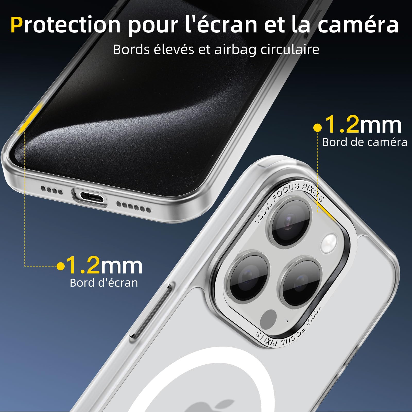 • Protection de l’appareil photo : Les rebords surélevés autour de l’écran et de l’objectif garantissent une protection supplémentaire contre les rayures et les chocs, même lorsque votre iPhone est posé face contre terre, pour une sécurité maximale.