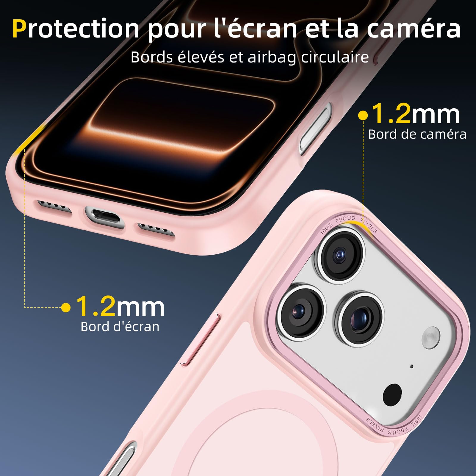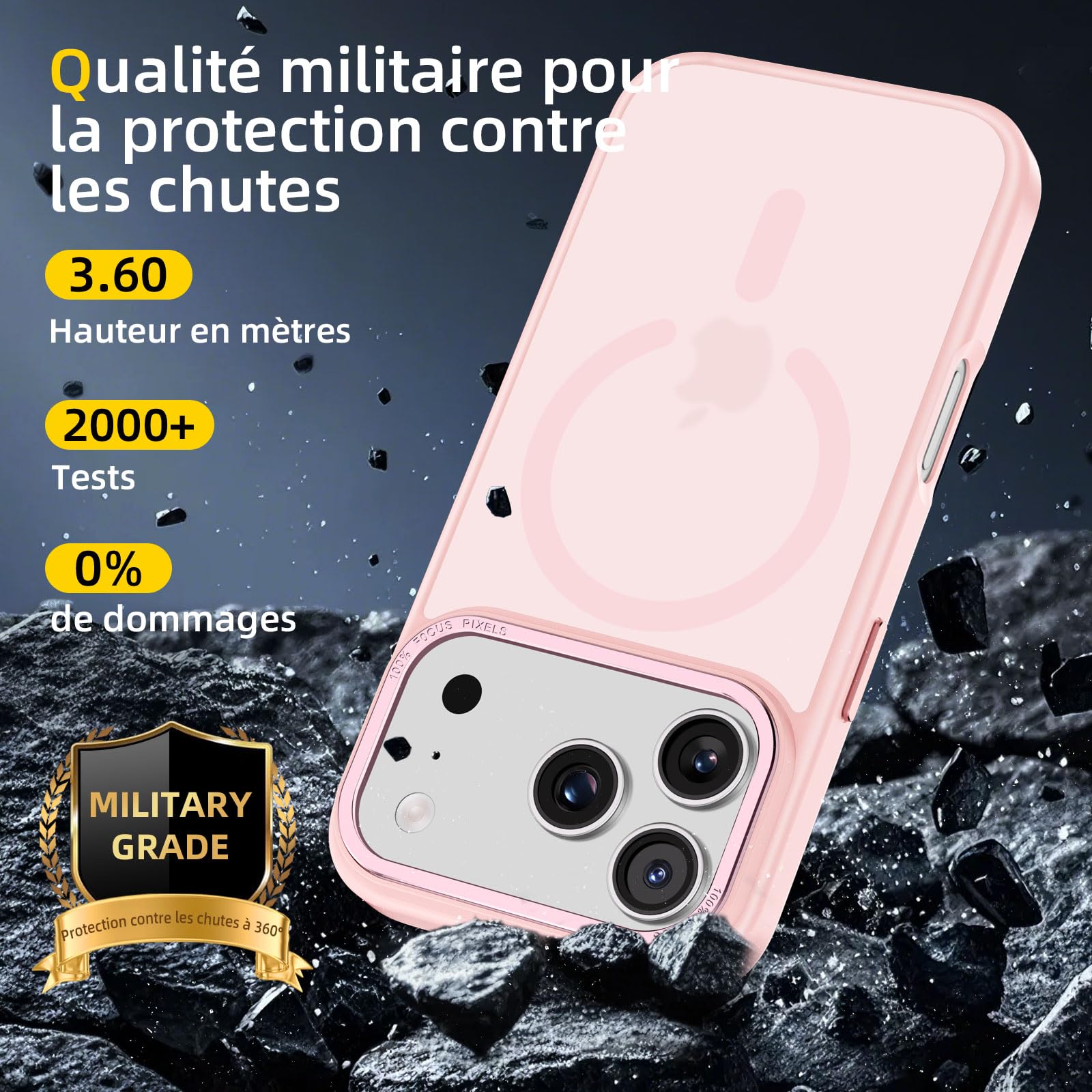 Coque magnétique antichoc pour iPhone 17 Pro Max, compatible MagSafe, avec protection militaire et finition rose.