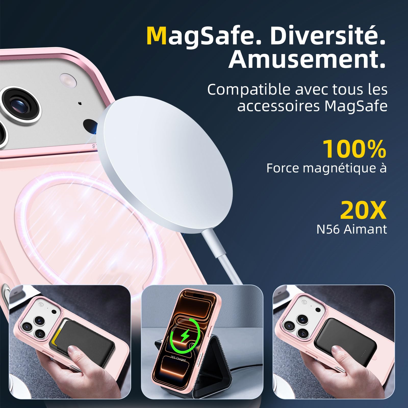 - Verrouillage magnétique ultra-puissant: Équipée de 42 aimants N56 de haute performance, cette coque offre une puissance magnétique augmentée de 50%, assurant une fixation stable et rapide de votre iPhone 17 Pro Max (6,9 Pouces) avec les accessoires compatibles MagSafe, même sur les routes les plus accidentées.