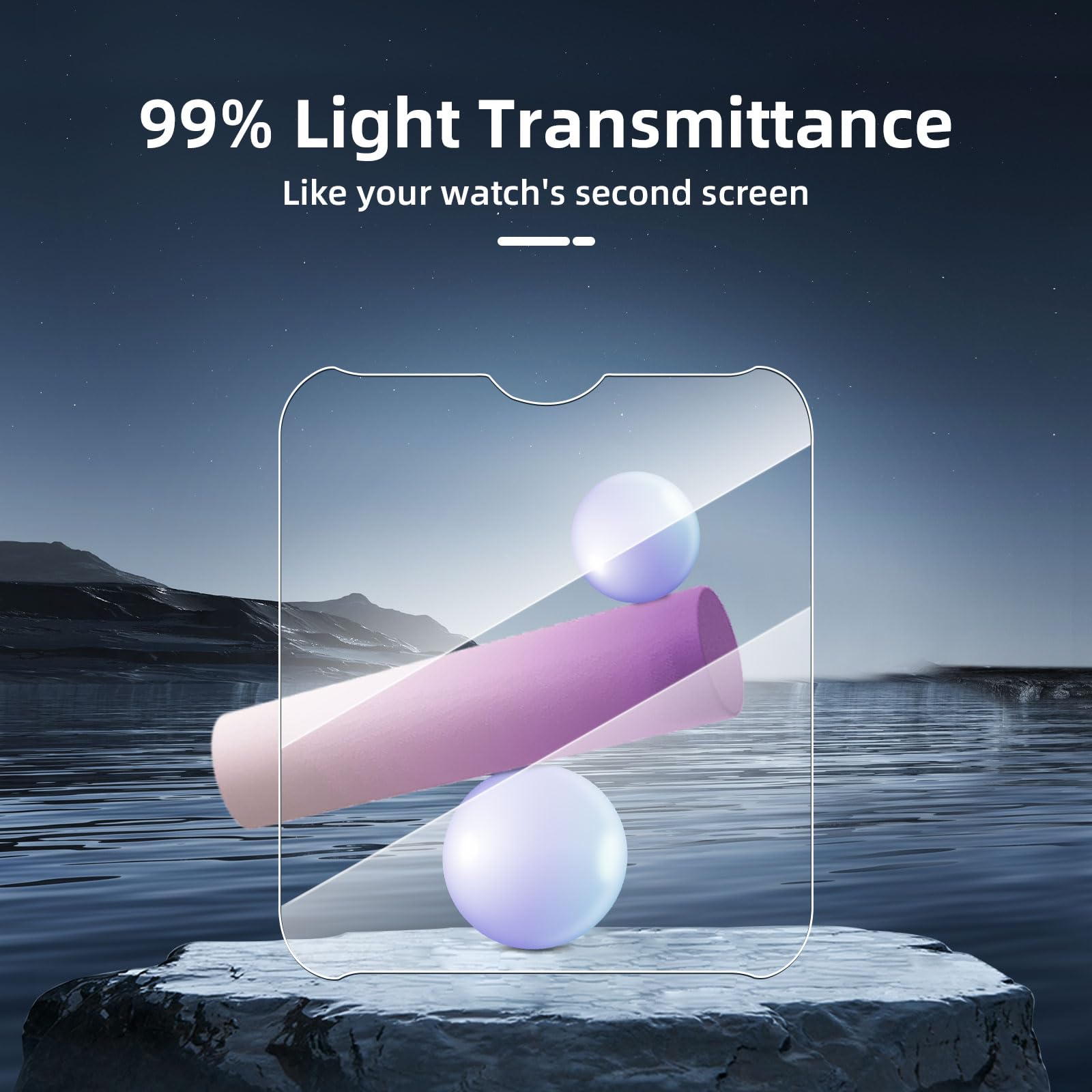 L’installation est un jeu d’enfant grâce à son adhésif en silicium solide qui assure une fixation ferme sans bulles d’air. De plus, le revêtement oléophobique empêche les empreintes digitales et autres contaminants, facilitant ainsi le nettoyage de l’écran. La finition transparente et brillante de cette protection d’écran s’harmonise parfaitement avec le design élégant de votre montre, tout en offrant une protection discrète mais efficace.