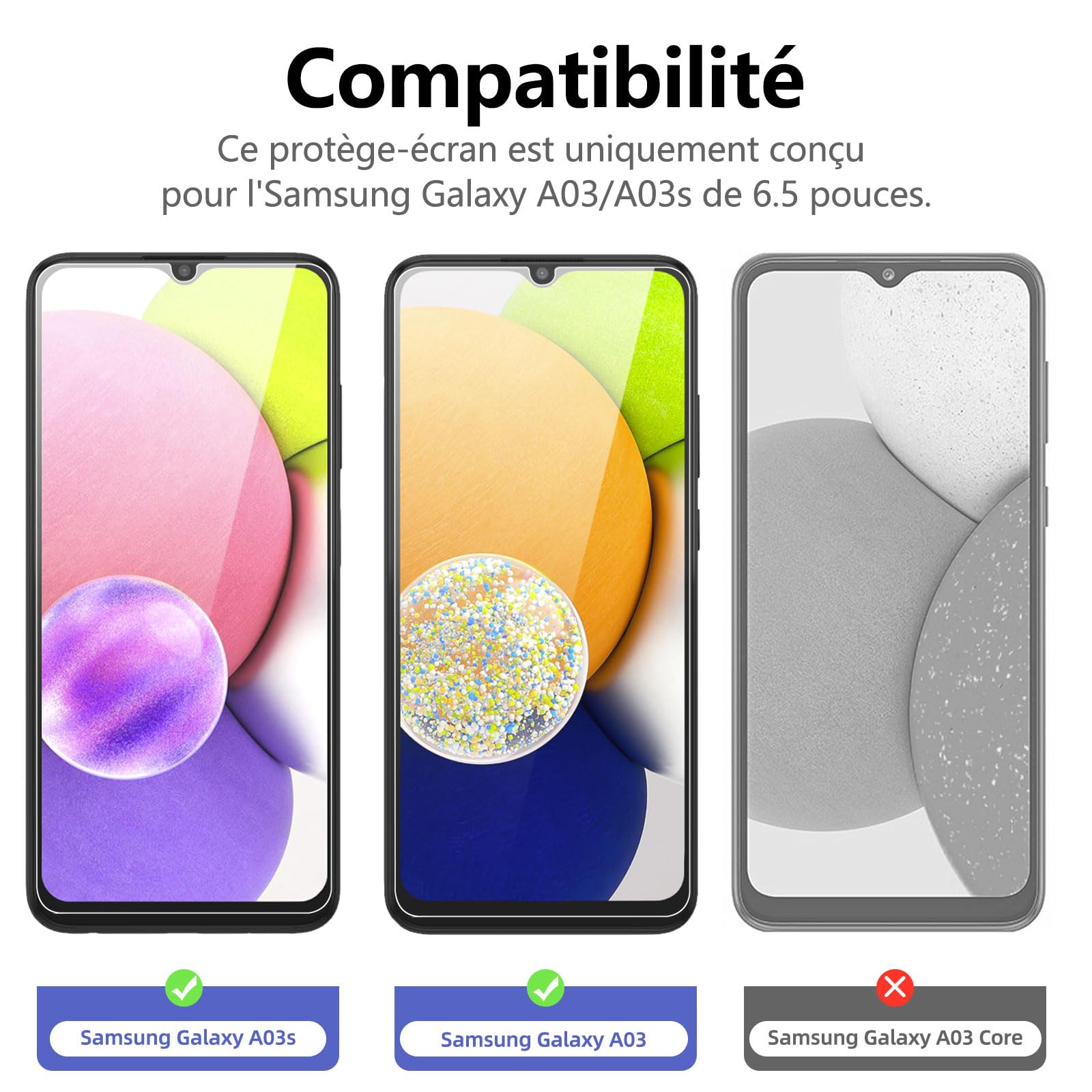 - Lot de 3 Verre Trempé Samsung Galaxy A03 / A03s / A02s. Très grande dureté: résiste aux égratignures jusqu’à 9H. Haute-réponse et haute transparence.