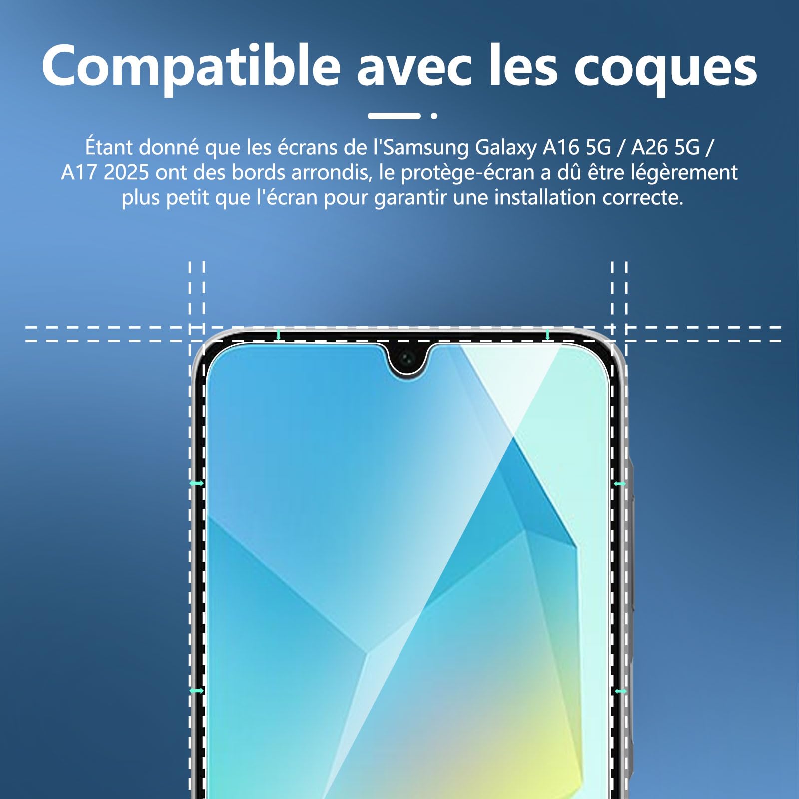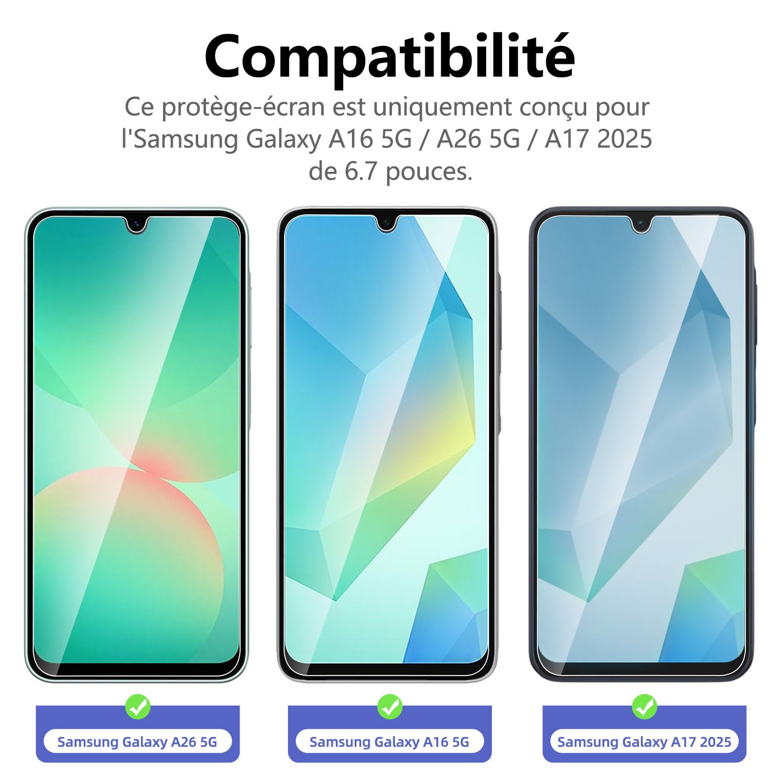 R : Oui, ce Protection d’écran Verre trempé Galaxy A17 2025 / Galaxy A16 5G / Galaxy A26 5G est parfaitement compatible avec : Galaxy A17 2025, Galaxy A16 5G, Galaxy A26 5G.