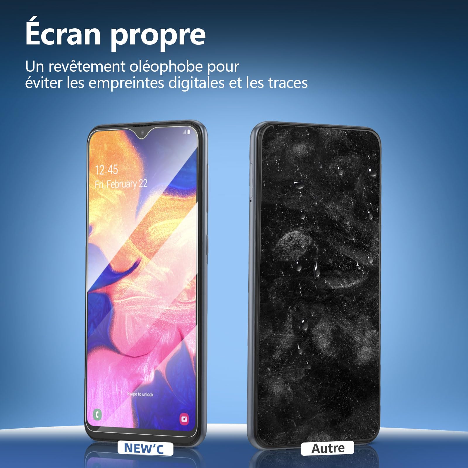 - Oléophobe: il a un revêtement oléophobique qui empêche les empreintes digitales et d’autres contaminants et rend le film facile à nettoyer.