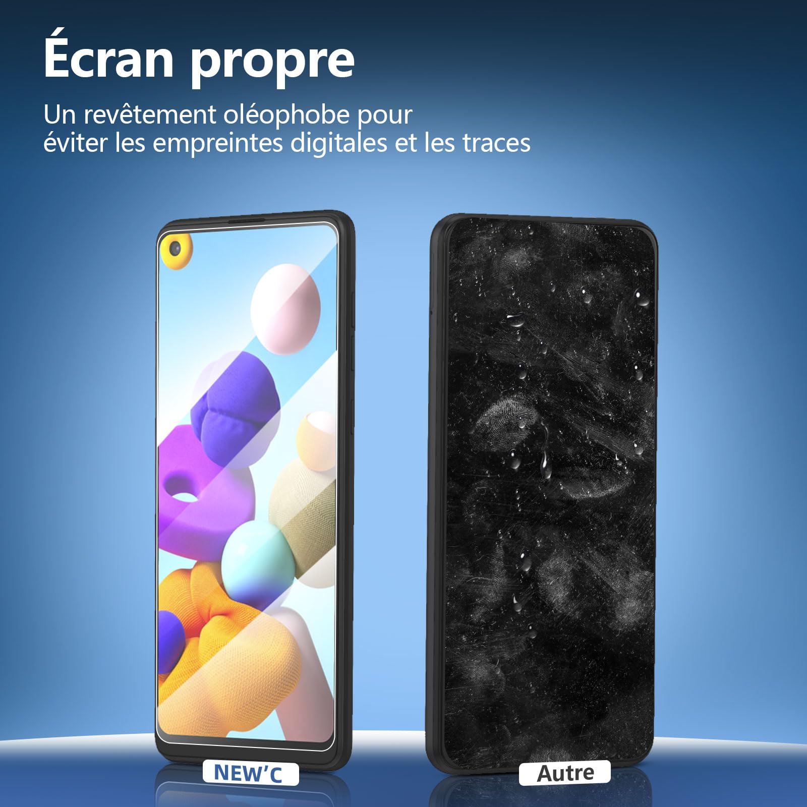 - NEW’C Protection d’écran en Verre Trempé Samsung Galaxy A21. Touche délicate: il est revêtu sur le dos avec un adhésif de silicium solide qui rend l’installation facile et attache le film fermement afin de ne pas influer sur la sensibilité de l’écran tactile. Installation sans poussière, sans empreintes digitales, facile d’une simple pression, sans bulles.
