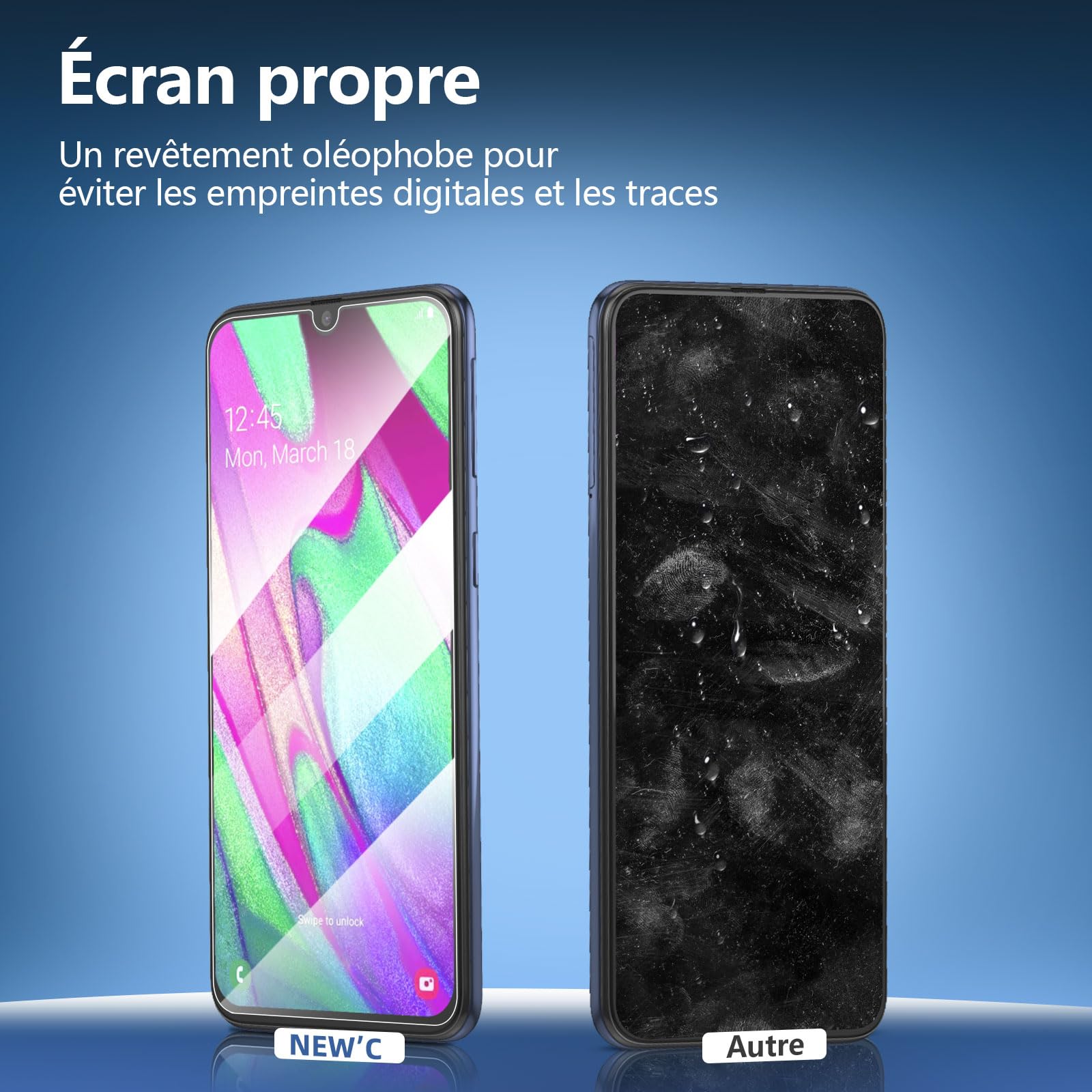 • Remarque: C’est parce que l’écran de Samsung Galaxy A40 est avec les bordures incurvés, donc le protecteur ne recouvre pas complètement l’écran, mais seulement la zone plate. Oléophobe: il a un revêtement oléophobique qui empêche les empreintes digitales et d’autres contaminants et rend le film facile à nettoyer.