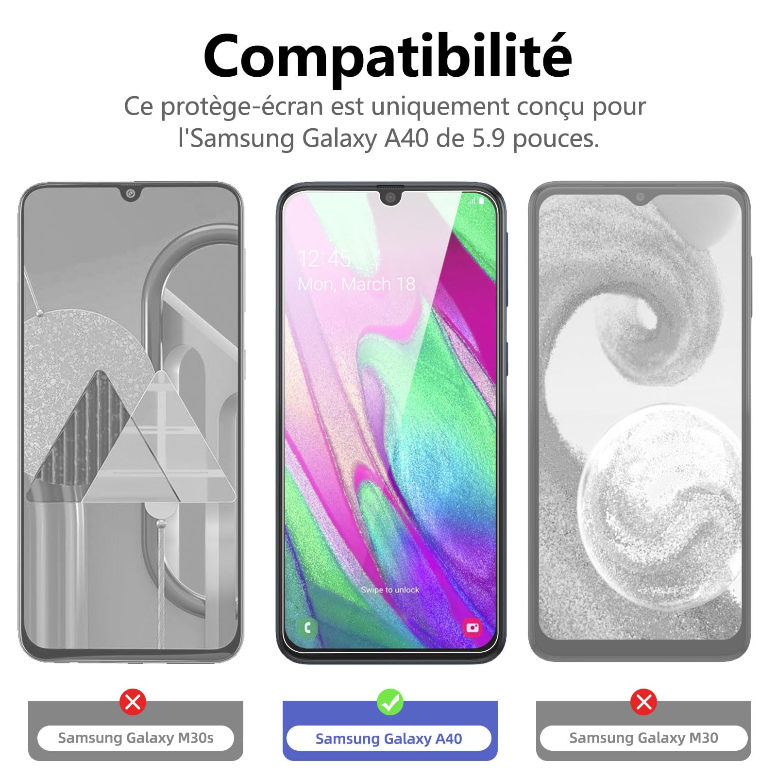 Compatibilité confirmée : Ce produit est spécialement conçu pour Galaxy A40.