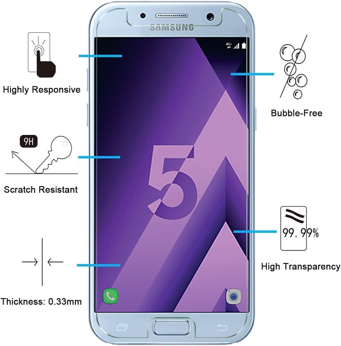 • Lot de 2 Verre Trempé Samsung Galaxy A5 2017 (SM-A520F), Très grande dureté: résiste aux égratignures jusqu’à 9H . Haute-réponse et une grande transparence.