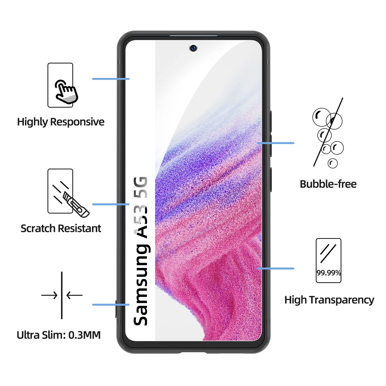 Les protections d’écran en verre trempé incluses sont conçues pour offrir une résistance exceptionnelle aux impacts et aux rayures grâce à leur dureté de 9H. Avec une épaisseur de seulement 0,33 mm, elles garantissent une haute transparence et une réponse tactile optimale, préservant la clarté et la sensibilité de l’écran de votre Galaxy A53.