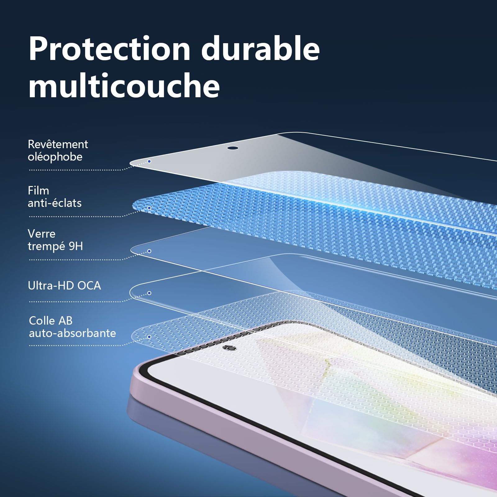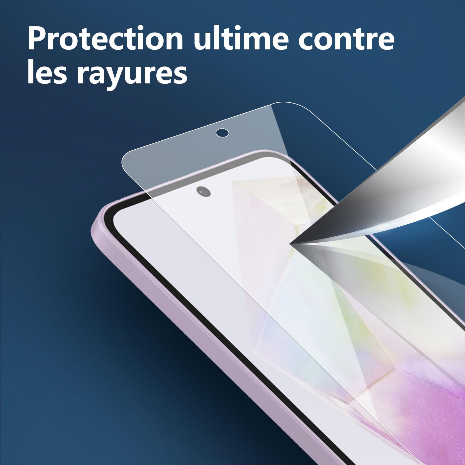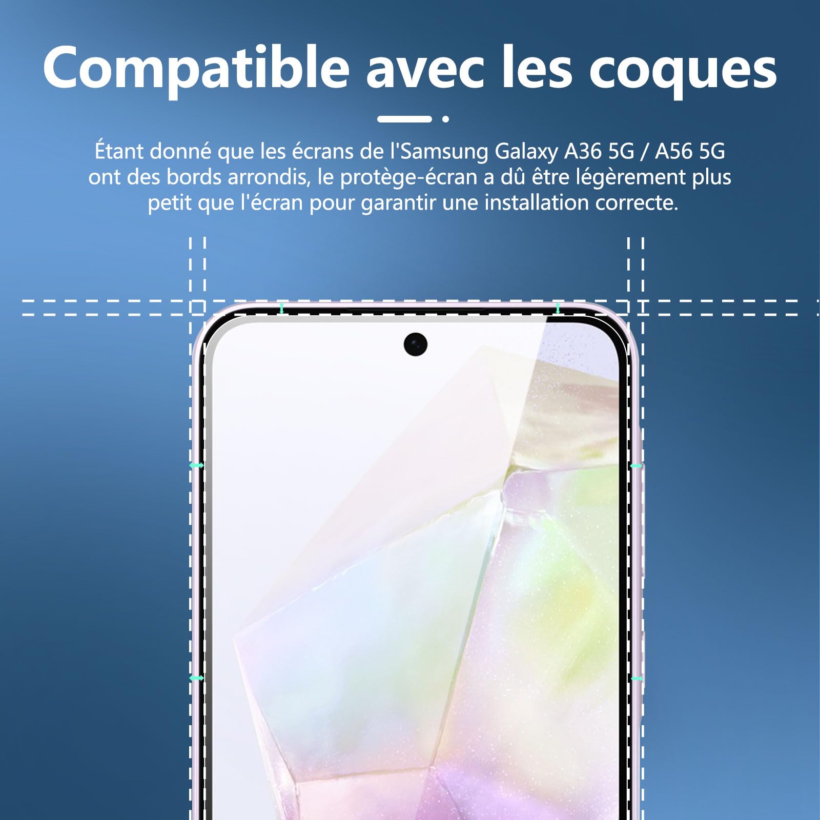 - NEW’C Protection d’écran en Verre Trempé Samsung Galaxy A56 5G / A36 5G. Touche délicate: il est revêtu sur le dos avec un adhésif de silicium solide qui rend l’installation facile et attache le film fermement afin de ne pas influer sur la sensibilité de l’écran tactile.
