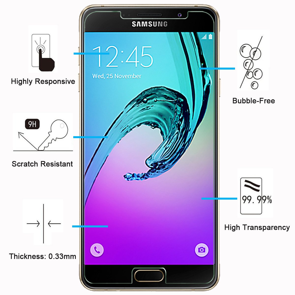 - Remarque: C’est parce que l’écran de Samsung Galaxy A7 2016 (A710) est avec les bordures incurvés, donc le protecteur ne recouvre pas complètement l’écran, mais seulement la zone plate. Oléophobe: il a un revêtement oléophobique qui empêche les empreintes digitales et d’autres contaminants et rend le film facile à nettoyer