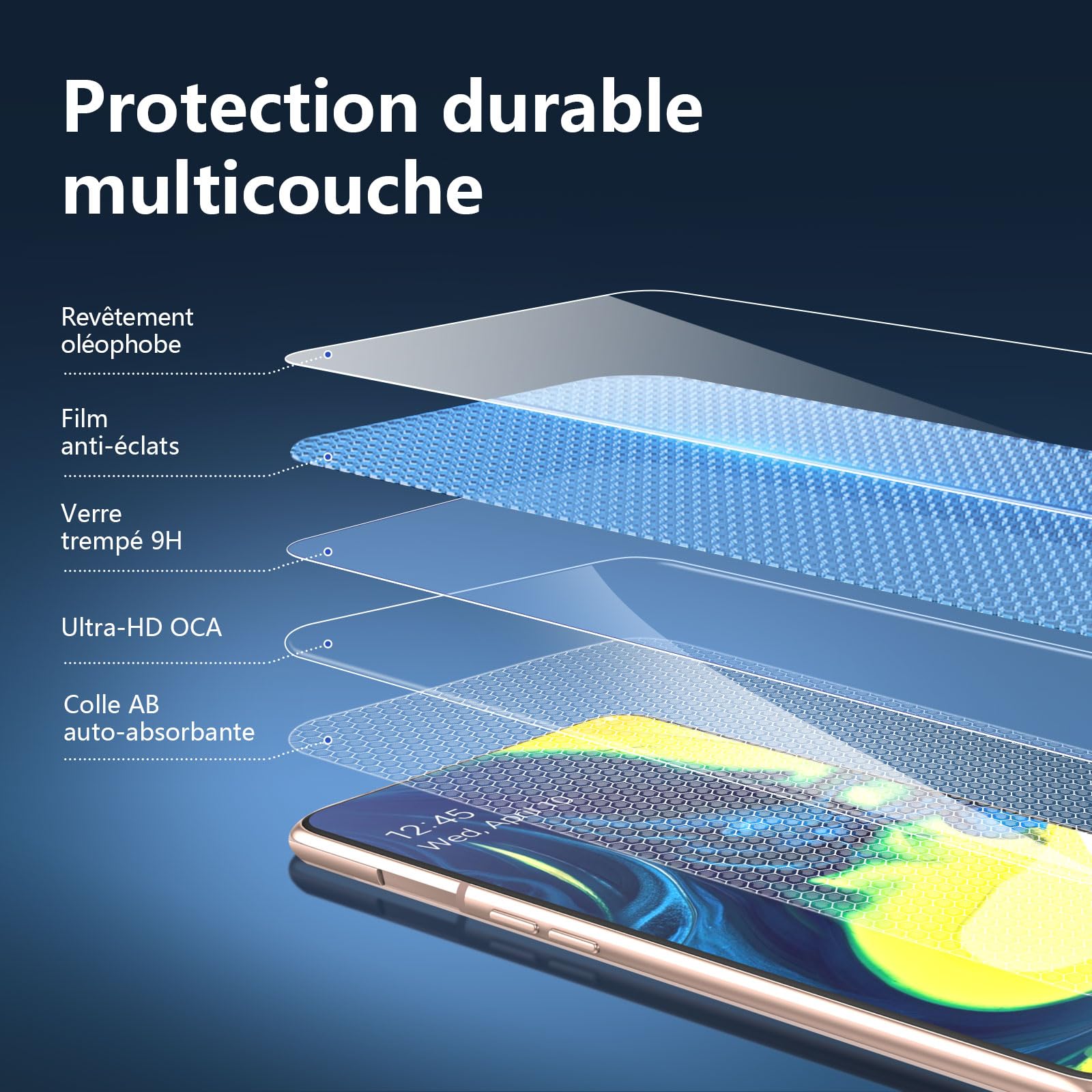 Protection d’écran en verre trempé pour Samsung Galaxy A80 et Galaxy A90, offrant une dureté de 9H, une épaisseur de 0,33 mm, et une transparence HD ultra claire.