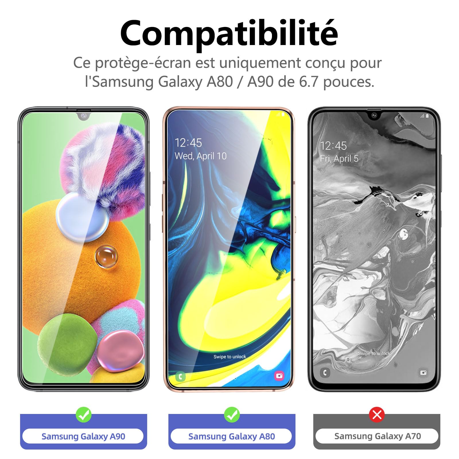 - Pack de 3 Verre Trempé Samsung Galaxy A80, Samsung Galaxy A90. Dureté 9H, résistance aux raillures. Réponse tactile améliorée et super transparent.