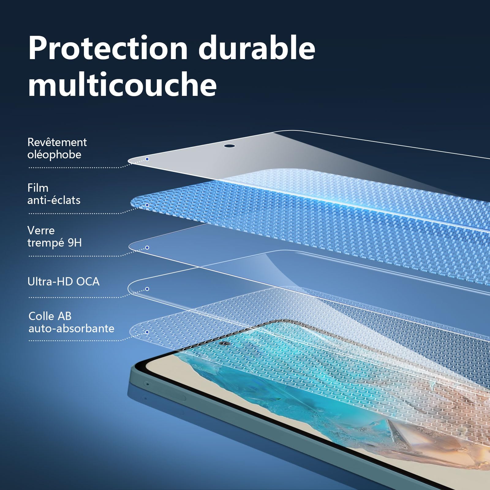 L’installation est un jeu d’enfant grâce à l’adhésif en silicium solide qui assure une application sans bulles et sans poussière. De plus, le revêtement oléophobe empêche les empreintes digitales et autres contaminants, rendant le nettoyage du verre très facile. Les bordures arrondies ajoutent une touche de confort et de sécurité, évitant les éclats et les dommages accidentels.