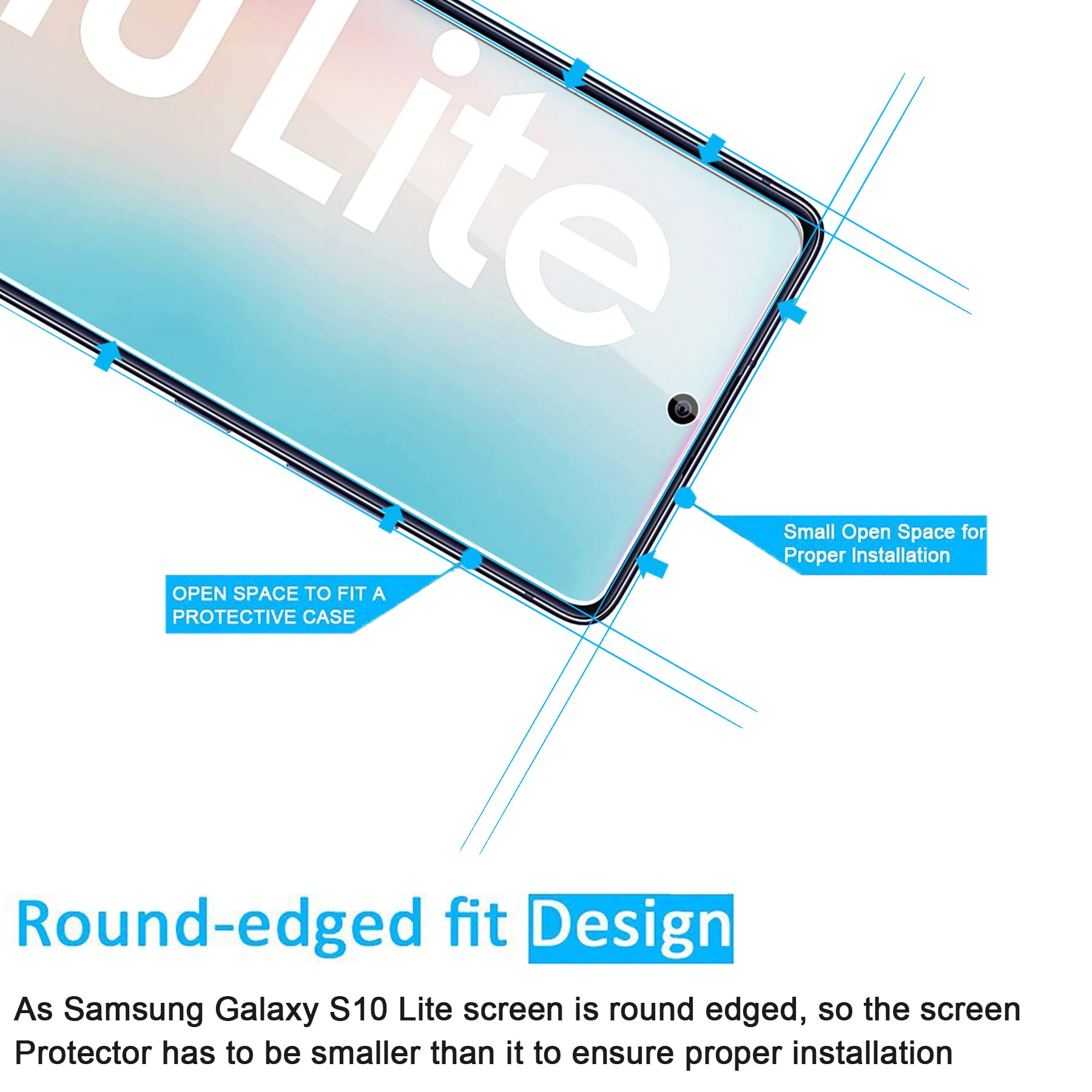 • Remarque: C’est parce que l’écran de Samsung Galaxy S10 Lite est avec les bordures incurvés, donc le protecteur ne recouvre pas complètement l’écran, mais seulement la zone plate.