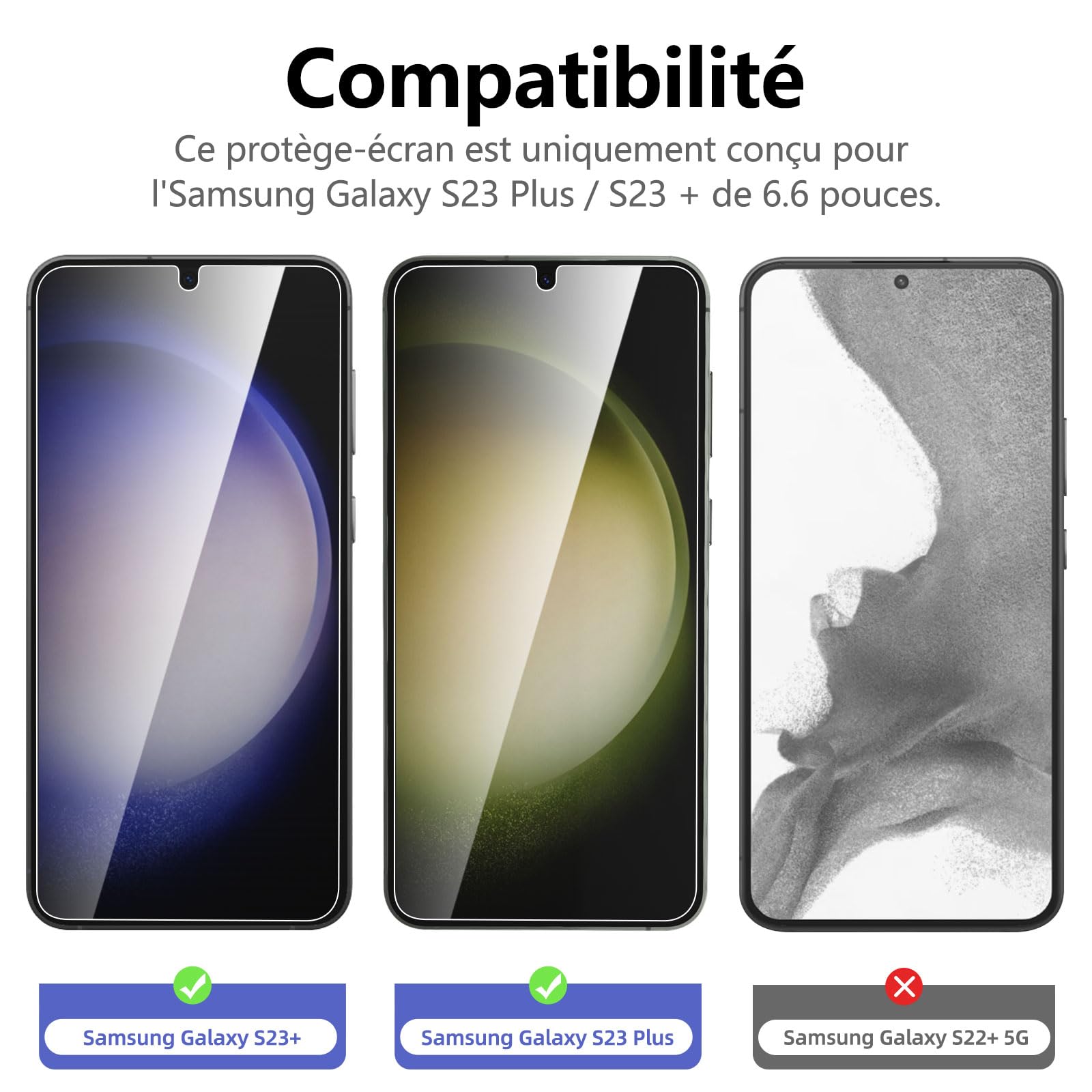 R : Oui, ce Protection d’écran Verre trempé Galaxy S23 Plus / Galaxy S23+ est parfaitement compatible avec : Galaxy S23 Plus, Galaxy S23+.