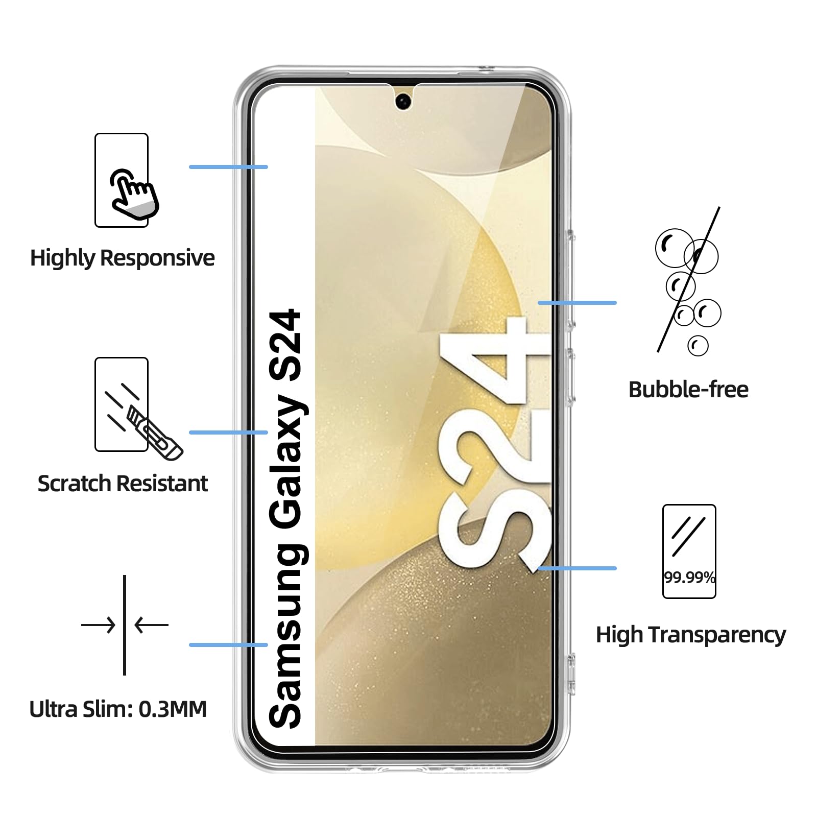 La protection d’écran en verre trempé est fabriquée à partir de matériaux de haute qualité, offrant une dureté exceptionnelle de 9H. Cela signifie qu’elle peut résister aux rayures et aux impacts, protégeant efficacement l’écran de votre téléphone contre les dommages accidentels. Avec une épaisseur de seulement 0,26 mm, elle assure une haute transparence et une réponse tactile optimale, vous permettant de profiter pleinement de l’affichage vibrant de votre Galaxy S24.