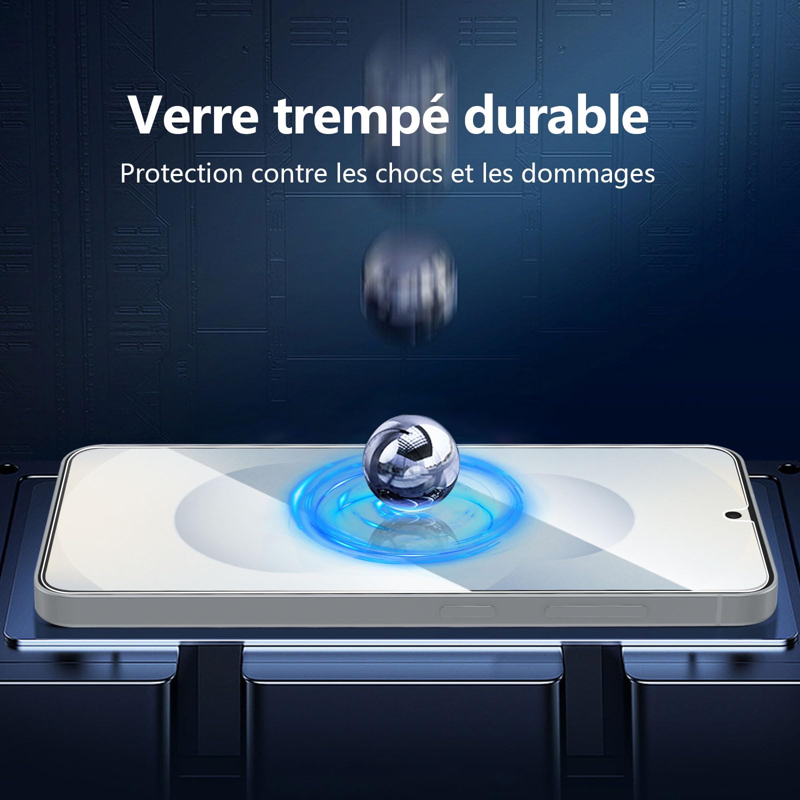 Protection d’écran en verre trempé pour Samsung Galaxy S25, offrant une dureté de 9H, une transparence HD et une installation sans bulles.