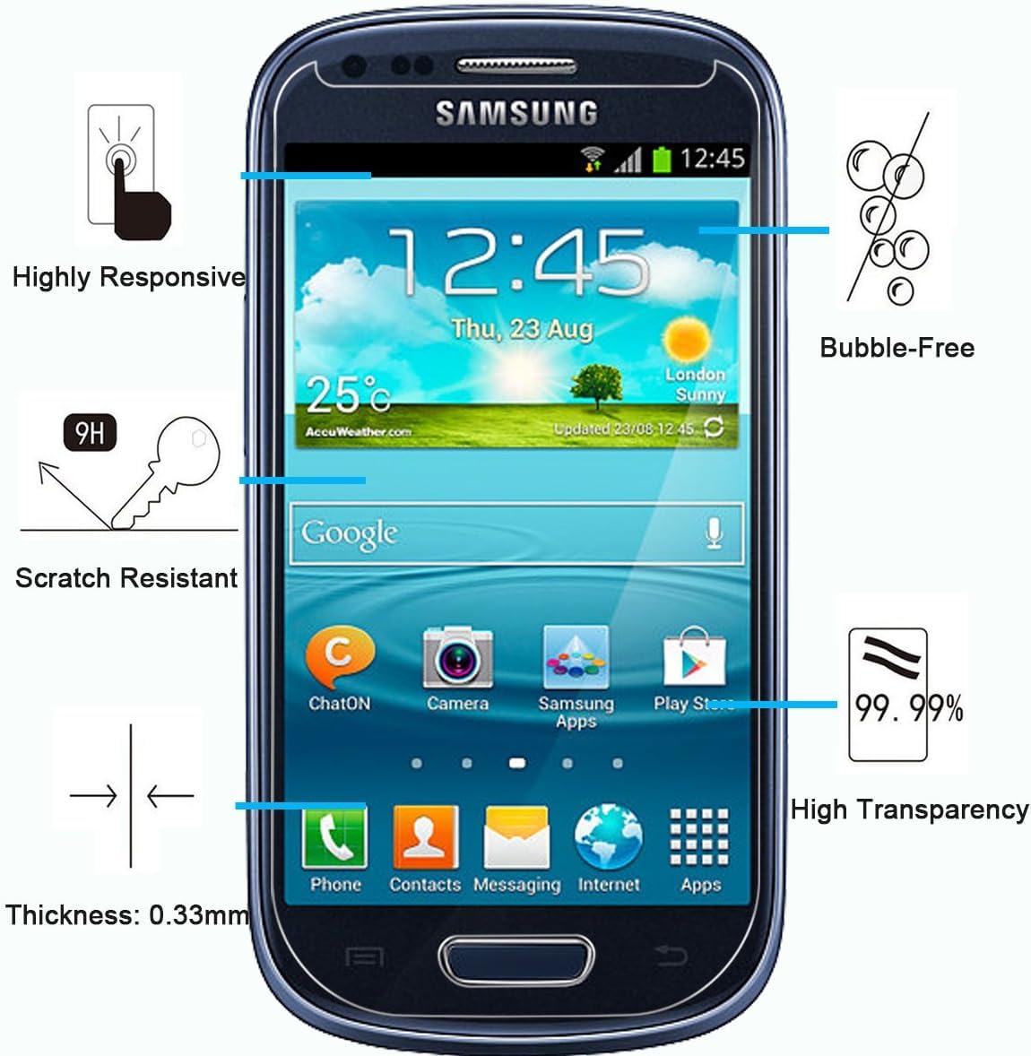 - Pack de 1 Verre Trempé Samsung Galaxy S3 MINI ,Très grande dureté: résiste aux égratignures jusqu’à 9H. Haute-réponse, haute transparence, et une grande transparence