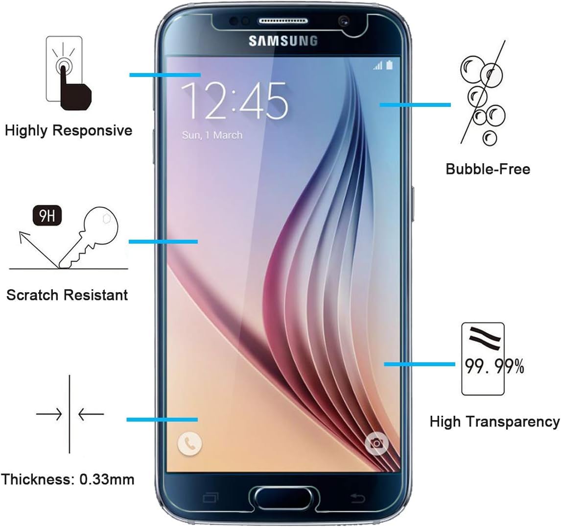 - Lot de 2 Verre Trempé Samsung Galaxy S6, Très grande dureté: résiste aux égratignures jusqu’à 9H . Haute-réponse et une grande transparence.