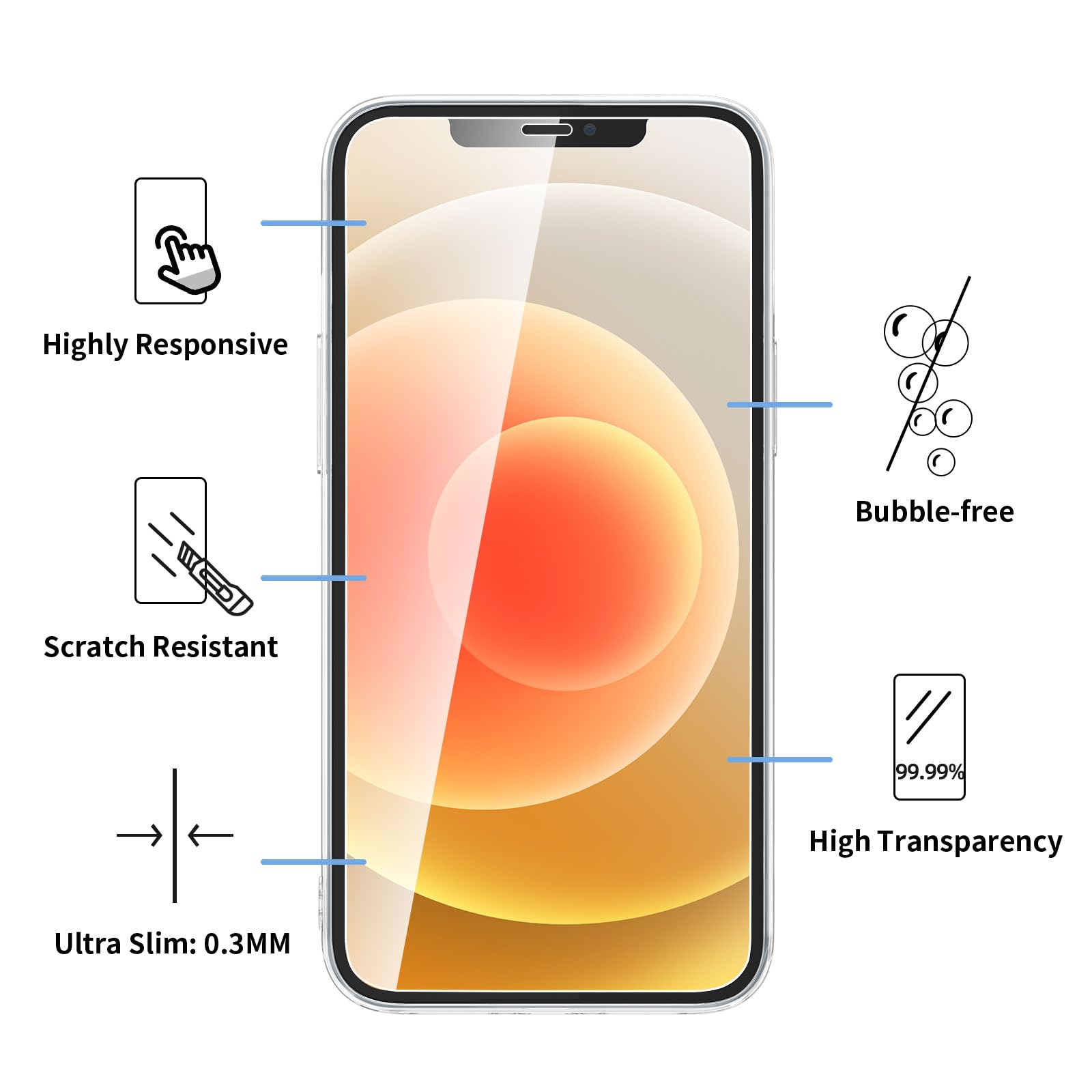 Les protections d’écran en verre trempé sont fabriquées à partir de matériaux de haute qualité, offrant une dureté exceptionnelle de 9H pour résister aux impacts et protéger l’écran de votre iPhone 12 Mini contre les chocs et les dommages accidentels. Avec une épaisseur de seulement 0,33 mm et des bordures arrondies, elles garantissent une haute transparence et une réponse tactile optimale, vous offrant une expérience utilisateur fluide et agréable.