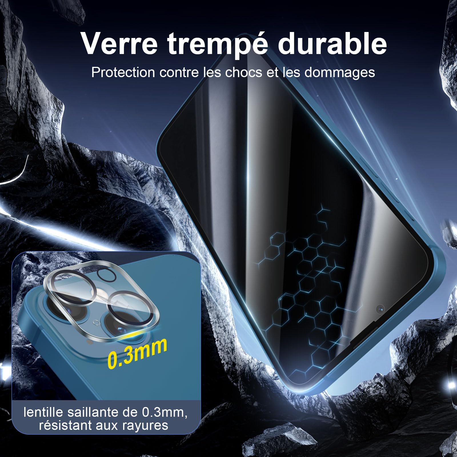 - Contenu : 3* Verre Trempé écran Protecteur anti-espion, 3* Caméra Lentille Protecteur pour iPhone 13 (6,1 Pouces) et un Bouchon Anti-Poussière. Une double protection avant et arrière du téléphone.