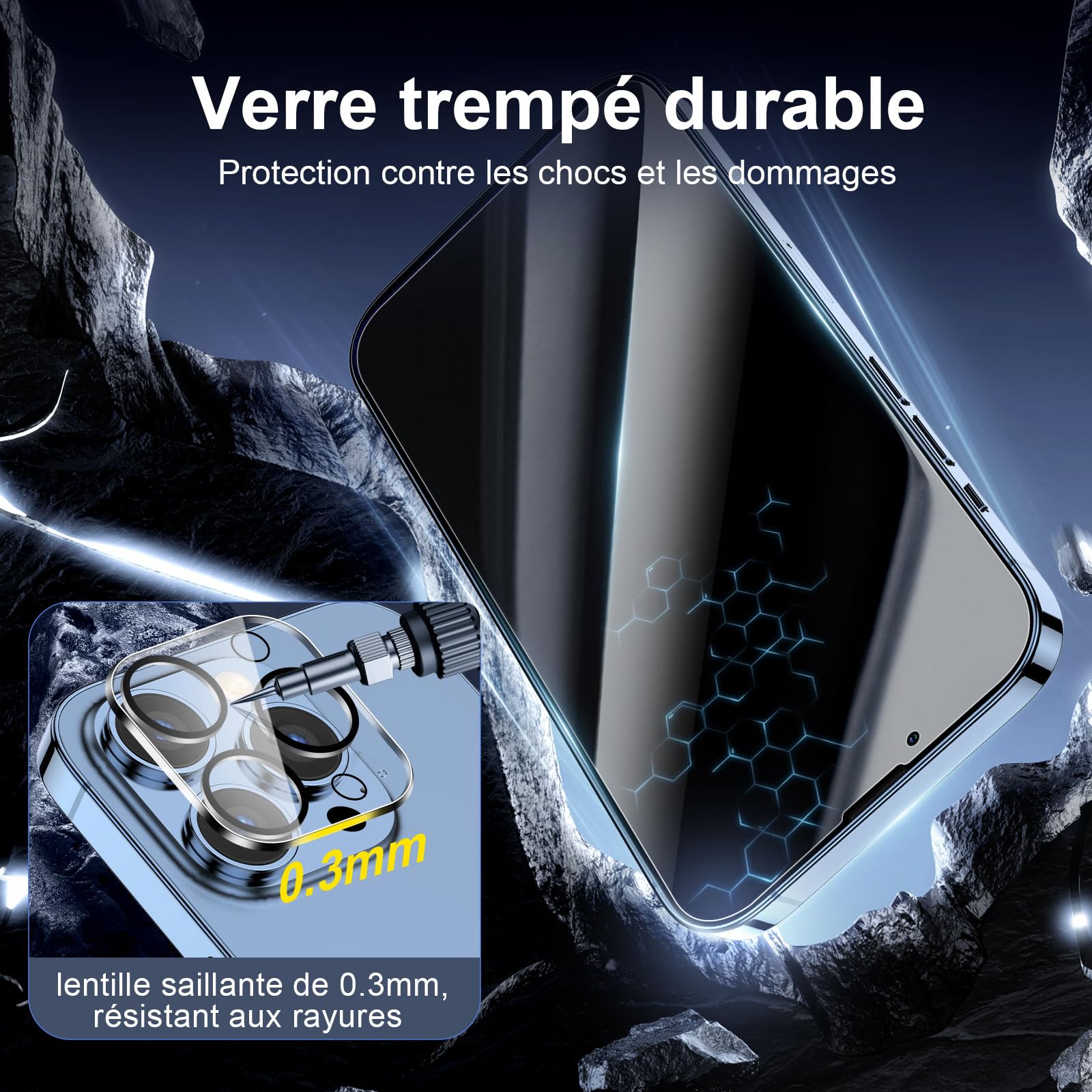 - Contenu : 3* Verre Trempé écran Protecteur anti-espion, 3* Caméra Lentille Protecteur pour iPhone 13 Pro (6,1 Pouces). et un Bouchon Anti-Poussière. Une double protection avant et arrière du téléphone.